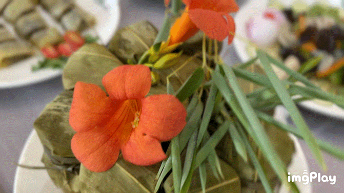 清早才劈的新竹,分节洗净、放入糯米、粽叶封口后入锅卤煮。不多时,米香竹香蒸腾满场。摆盘中插上尚沾着露水的山花,这就是竹筒饭“月光下的凤尾竹”。