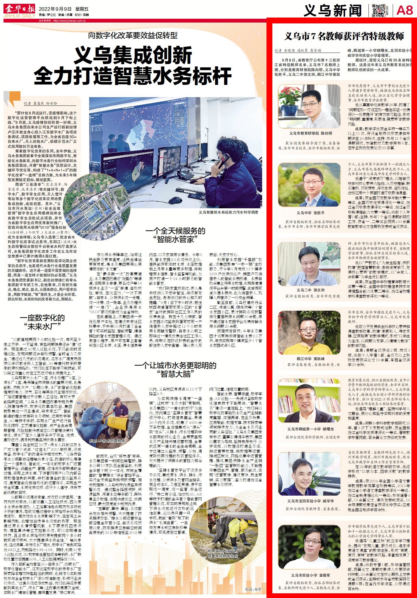 9月8日,省教育厅公布第十三批浙江省特级教师名单,义乌市7名教师上榜,分别是教育研修院陈向明、义乌中学张胜平、义乌二中骆文洲、稠江中学黄跃峰、稠城第一小学楼曙光、龙回实验小学臧学华和实验小学章锡军。