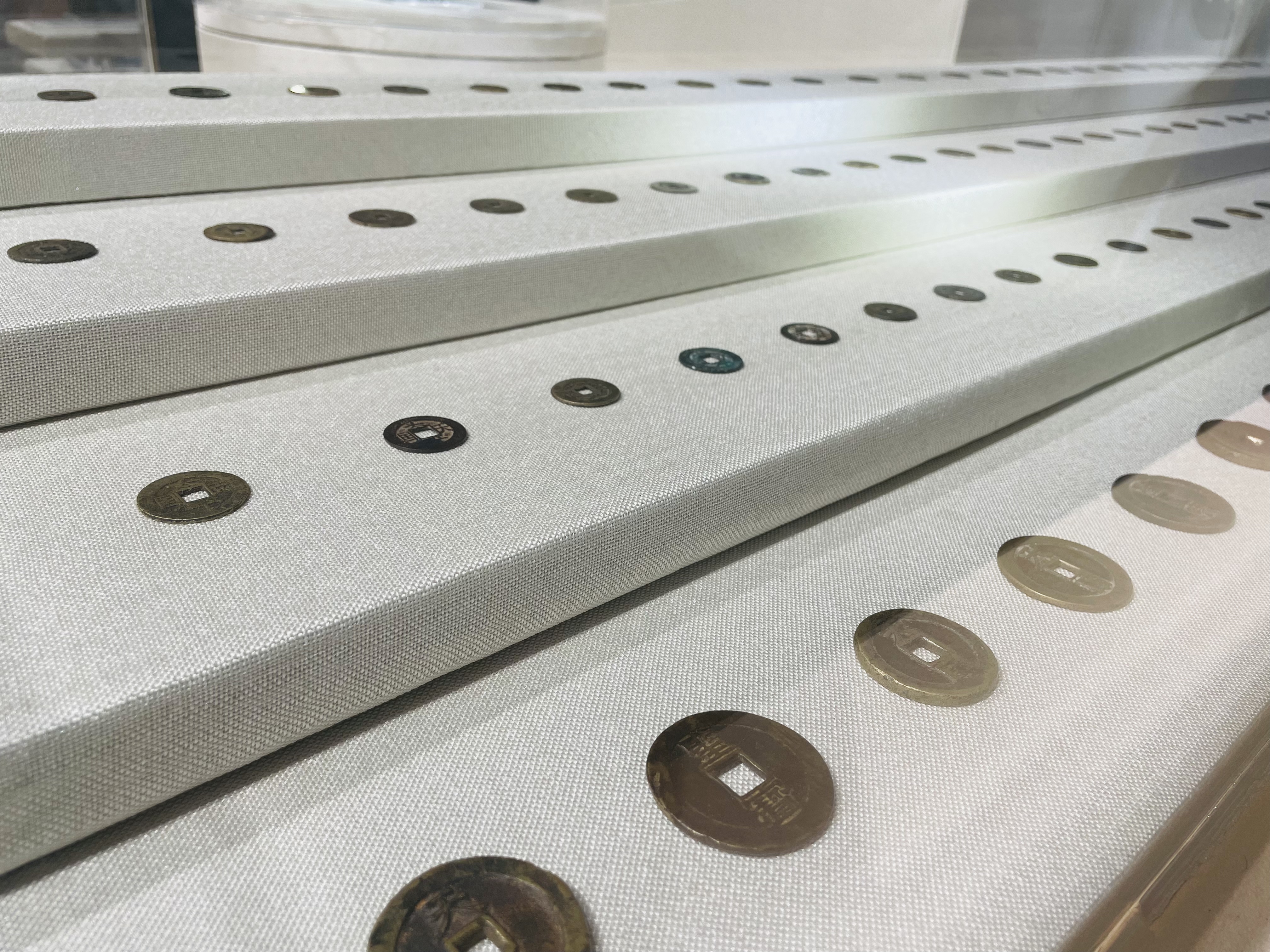 6、修整钱币——把刚脱模的钱币毛刺打磨干净,一般用木条穿起来进行批量打磨