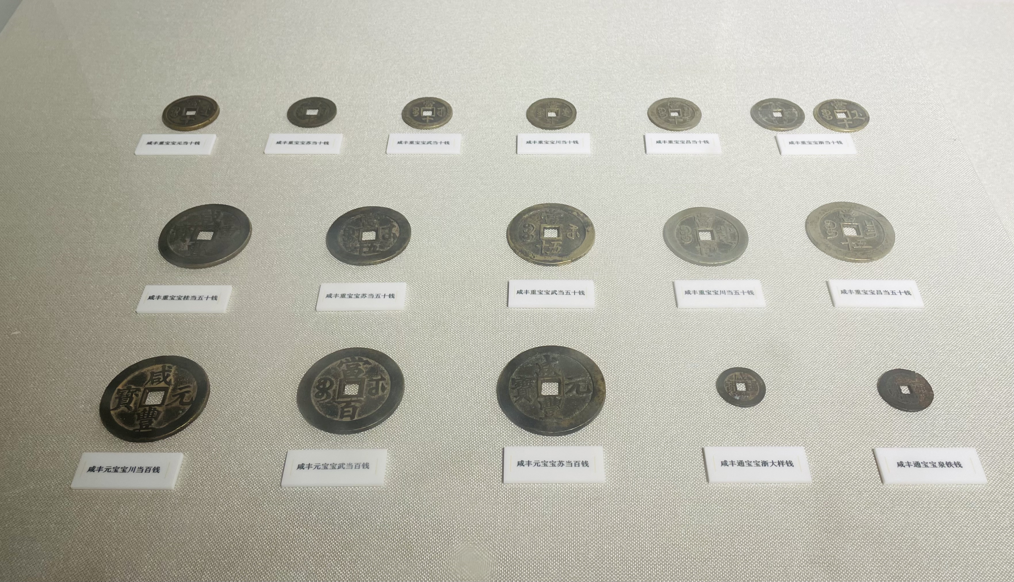 本次“圣宝太平”太平天国钱币特展,展出近200余枚民间钱币藏品,包含小平钱、折五钱、当十钱、当五十钱等常见钱币,还有咸丰钱币、小刀会钱币、天地会钱币等同时期、区域性使用的多种钱币,凸现太平天国时期钱币“百花齐放”的局面。