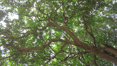 整株树树形美观,枝条向四周盘旋舒展,像一把大伞。那桂树的叶子,在秋天里,滋润着山光秋色,分外翠绿。树下掉满已经干枯的桂花,数量之多不禁让人想象它开花时的繁盛。听说,即便是今年盛夏高温天,叶子依然茂盛。