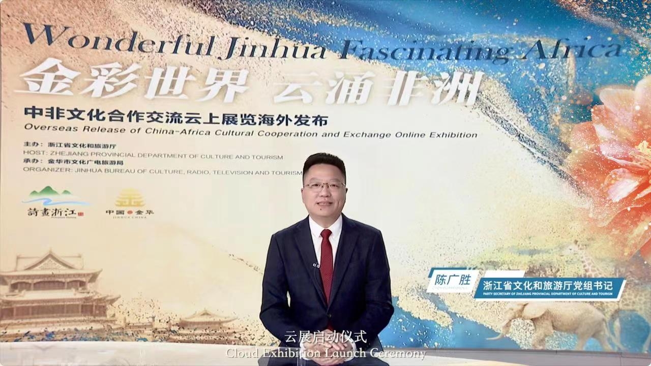 浙江省文化和旅游厅党组书记陈广胜通过VCR致辞:“文化艺术是世界的语言。非洲广袤的草原、热情的人民、动人的绘画,处处体现了人与自然的和谐。浙江金华,同样用自然与活力孕育精彩,用文化和诗意点缀生活。”他表示,期待以此次云展活动为契机,促进双方进一步加深合作,实现互利共赢。