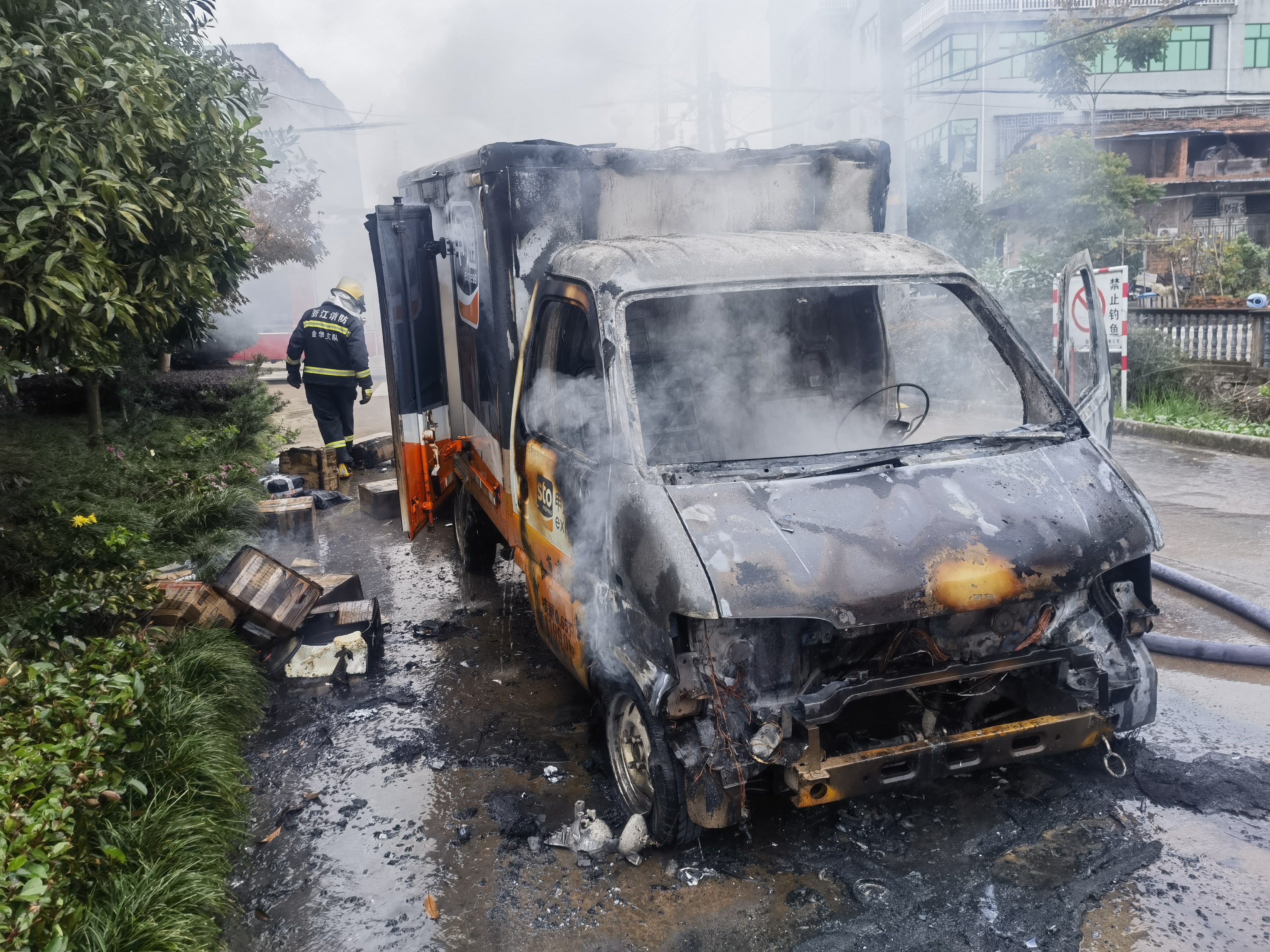 12月7日15时38分,永康市消防救援大队接到报警称,西城街道樟塘村一辆电动货车着火,大队立即出动1车8人前往处置。据了解,起火车辆为运输快递的小型新能源货车,起火部位是驾驶室,后仓堆放了大量的快递包裹。