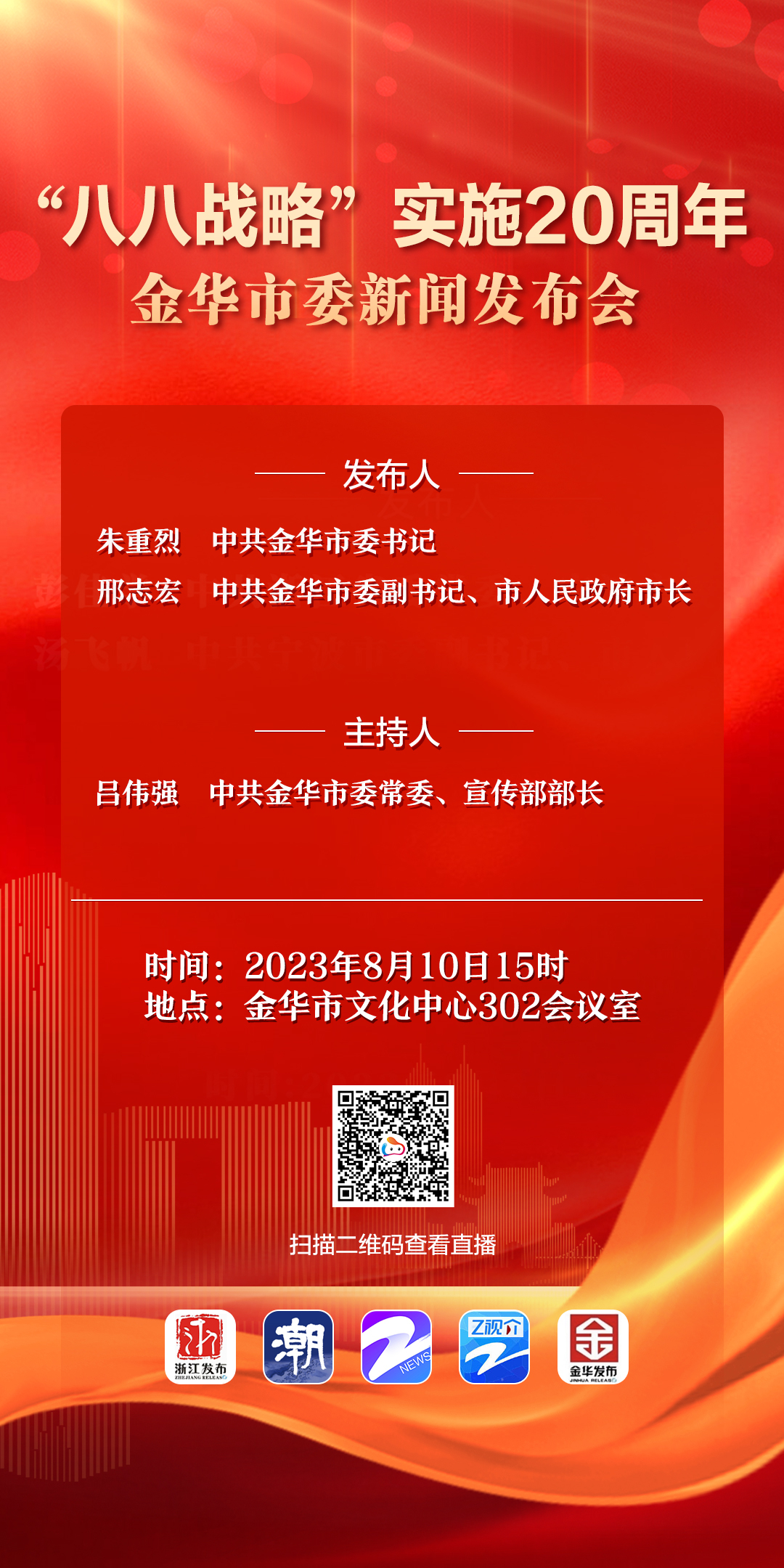 浙江发布、潮新闻、中国蓝新闻、z视介、金华发布、金彩云等平台将直播新闻发布会,欢迎关注!