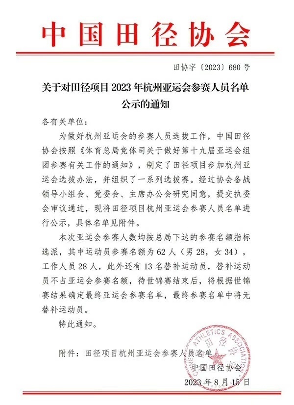 8月15日,中国田径协会官网正式发布《关于对田径项目2023年杭州亚运会参赛人员名单公示的通知》(以下简称《通知》)。