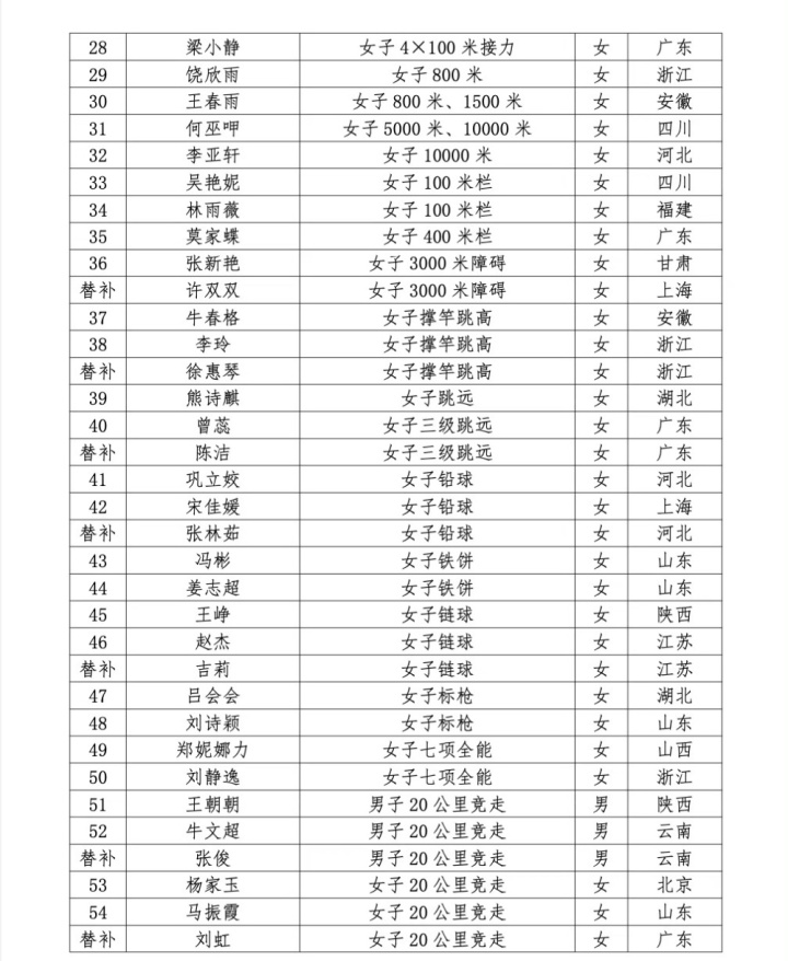根据《通知》显示,本届杭州亚运会,中国田径协会派出参赛运动员62人(男28、女34),工作人员28人,此外还有13名替补运动员。其中,替补运动员不占亚运会参赛名额,待布达佩斯田径世锦赛结束后,将根据世锦赛结果确定最终亚运会参赛名单,最终参赛名单中将无替补运动员。
