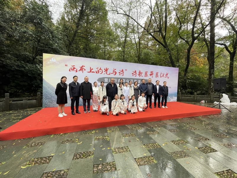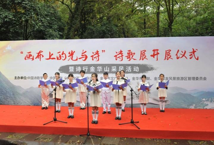 11月22日,雨后的双龙洞口时隐时现,叶圣陶碑文广场传来一阵孩子们的朗诵声。以“画布上的光与诗”为主题的诗歌展开展仪式,在金华双龙风景旅游区叶圣陶碑文广场举行。来自金华市罗店小学的同学们,朗诵了诗人木汀的《梦里的雪山》,引来现场游客和嘉宾的阵阵掌声。