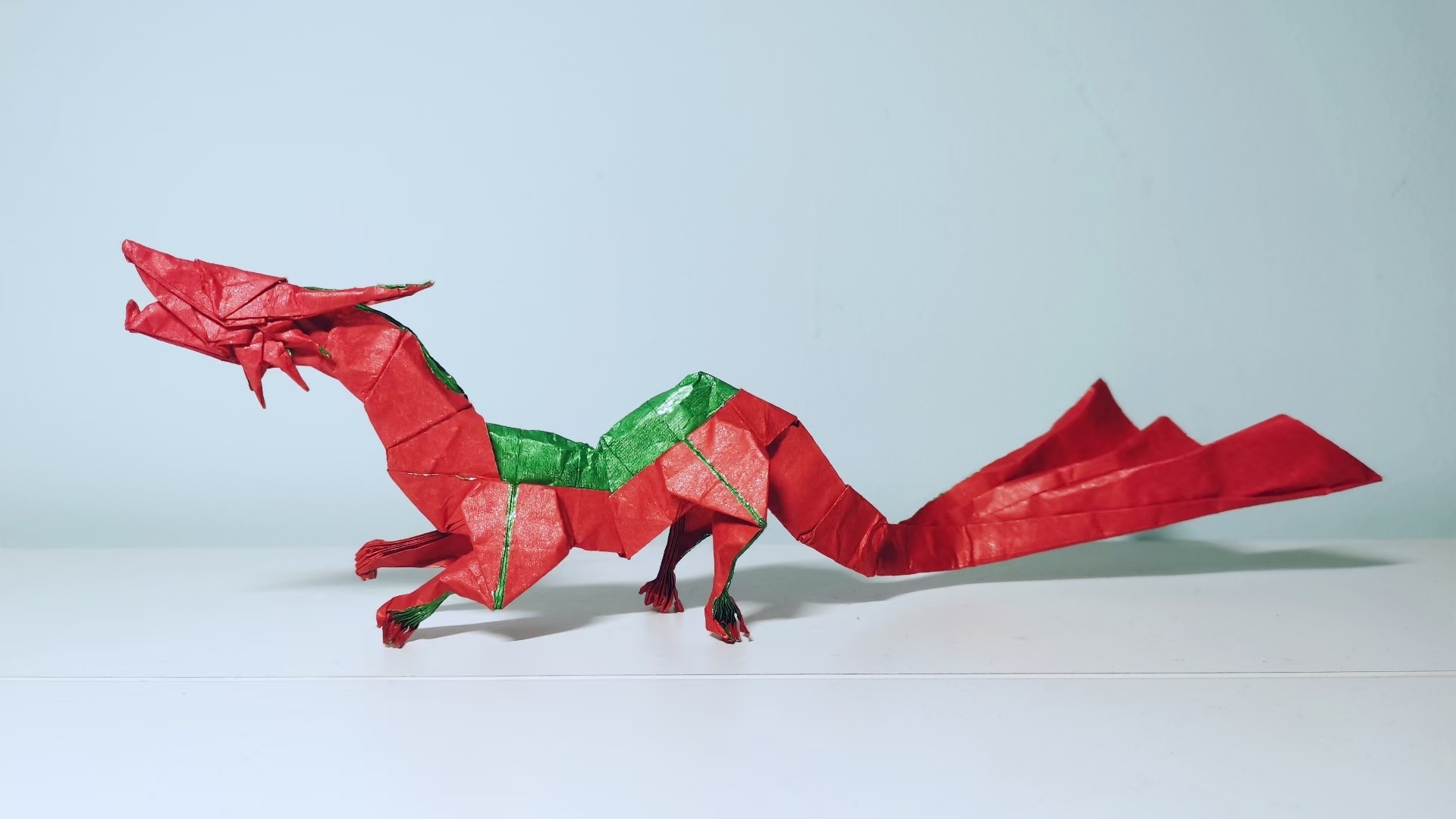 今年是龙年,他折了个《中国龙》的作品。杨爸爸告诉记者,其实从2022年的虎年开始,杨冠霖迎接新年的方式,就是用纸折出当年的生肖。跟以往不同的是,以前折纸都用一张纸完成,而今年因为龙的身子太长,他分成了龙头、龙身、龙尾三部分,最后将其拼接在一起。总共100多个步骤,耗时3个多小时完成。