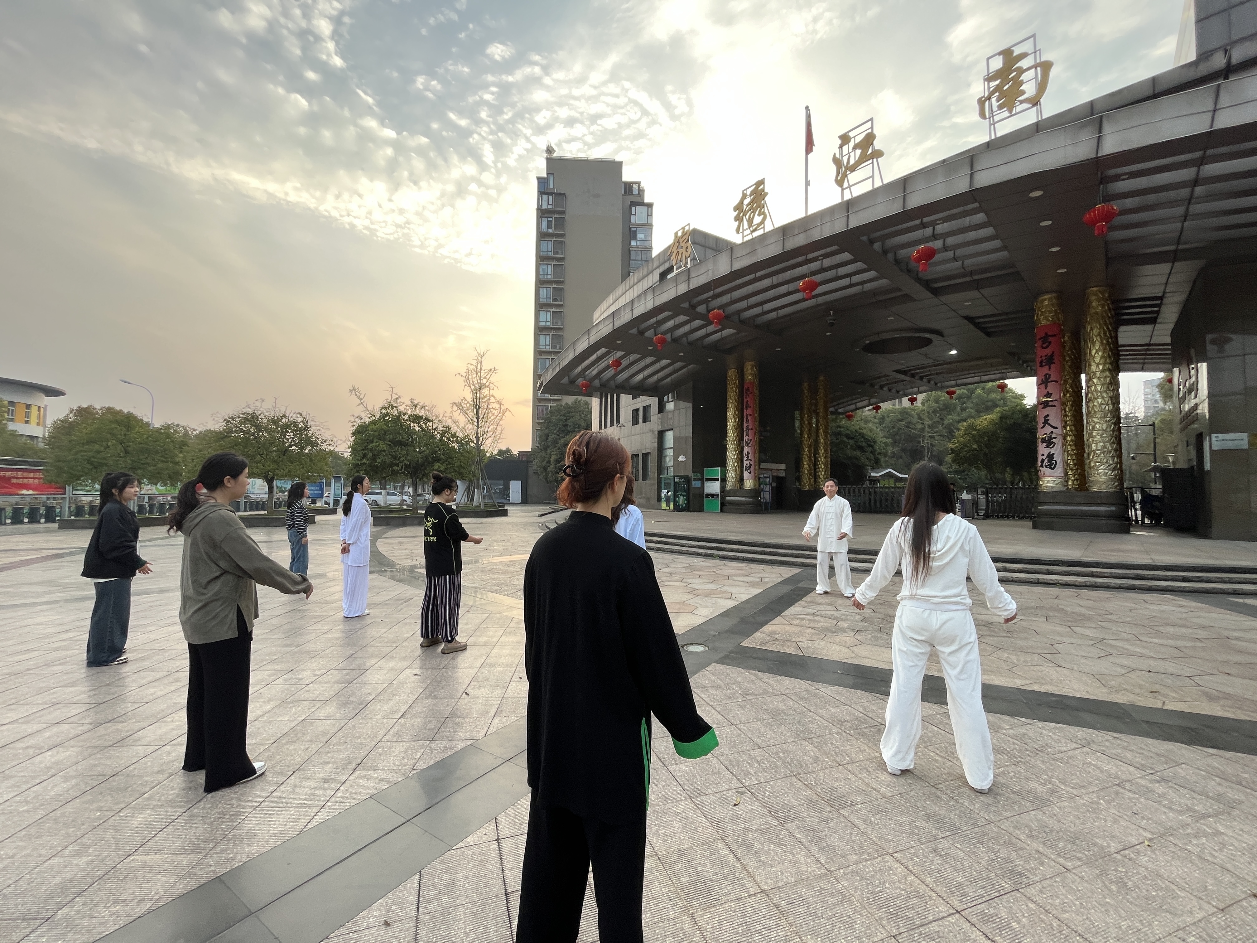 早上6点,天微微亮,在永康锦绣江南小区门正面广场,退休教师翁龙起打起了八段锦。而在下面有模有样跟着练的,是一群90、00后的年轻人。
