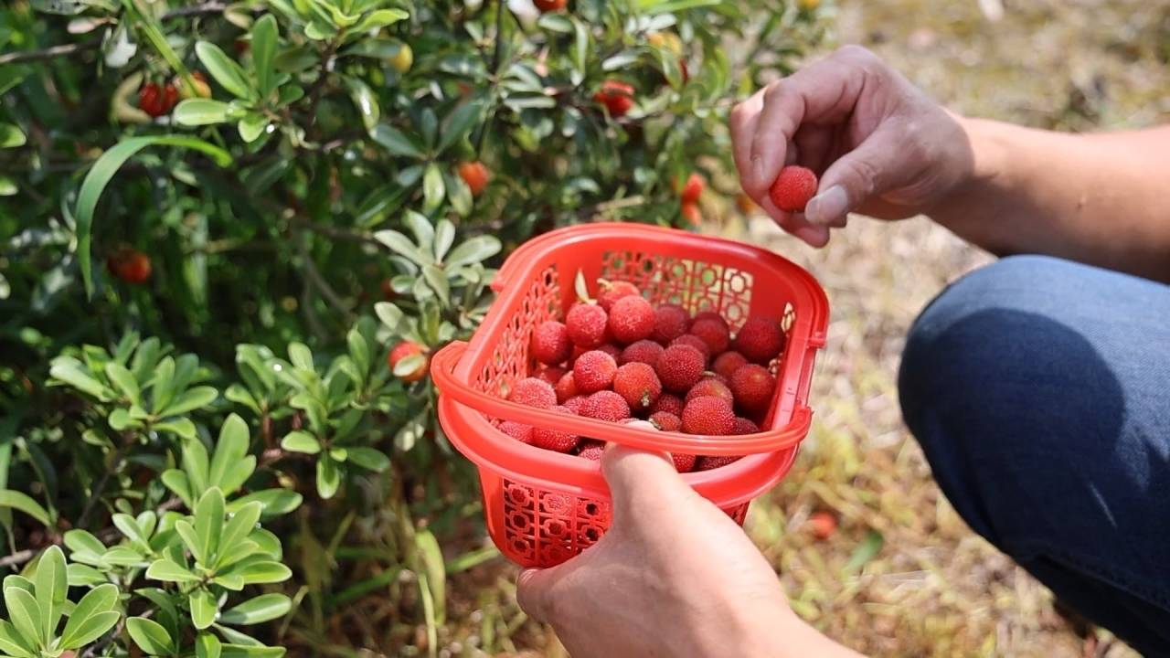 因为阳光充足,每一棵杨梅树基本上都是生长在树顶端的杨梅先红起来,这也得益于种植户舒进在春天对杨梅树多次进行整枝疏果。舒进告诉记者,他要把每棵杨梅树的产量控制在100斤左右,确保每一颗杨梅都长得饱满。