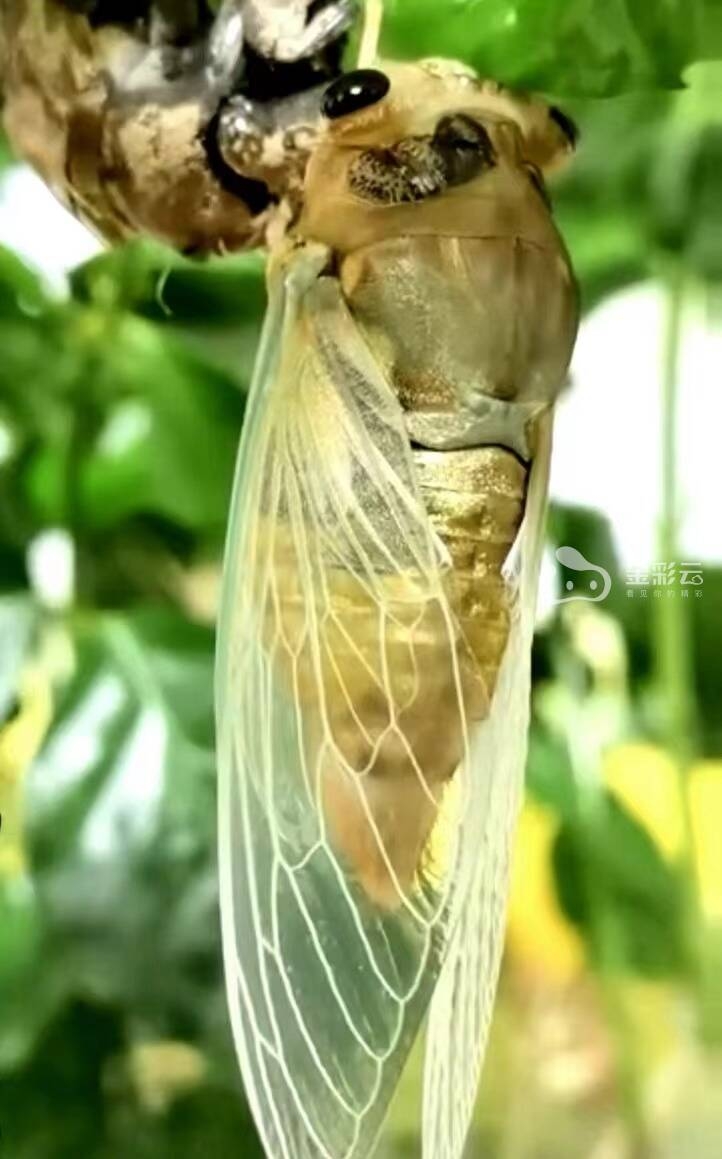 “金蝉开始准备蜕壳了。”吴涛有些激动,决定记录下“金蝉脱壳”的全过程。次日凌晨1时36分,金蝉完全从壳体中脱离了。刚出壳时带着点乳白色夹杂着浅灰黑躯体的小金蝉,动作非常迟缓,翅膀像是卷叶菜似的,撑不起来。翅膀的颜色是浅浅的绿和淡淡的黄。又过了20多分钟,金蝉现出金光闪闪的“玉体”,翅膀也变得透明了。“也许这就是古人为什么把小小的知了,比喻成‘金蝉’的原因吧。”