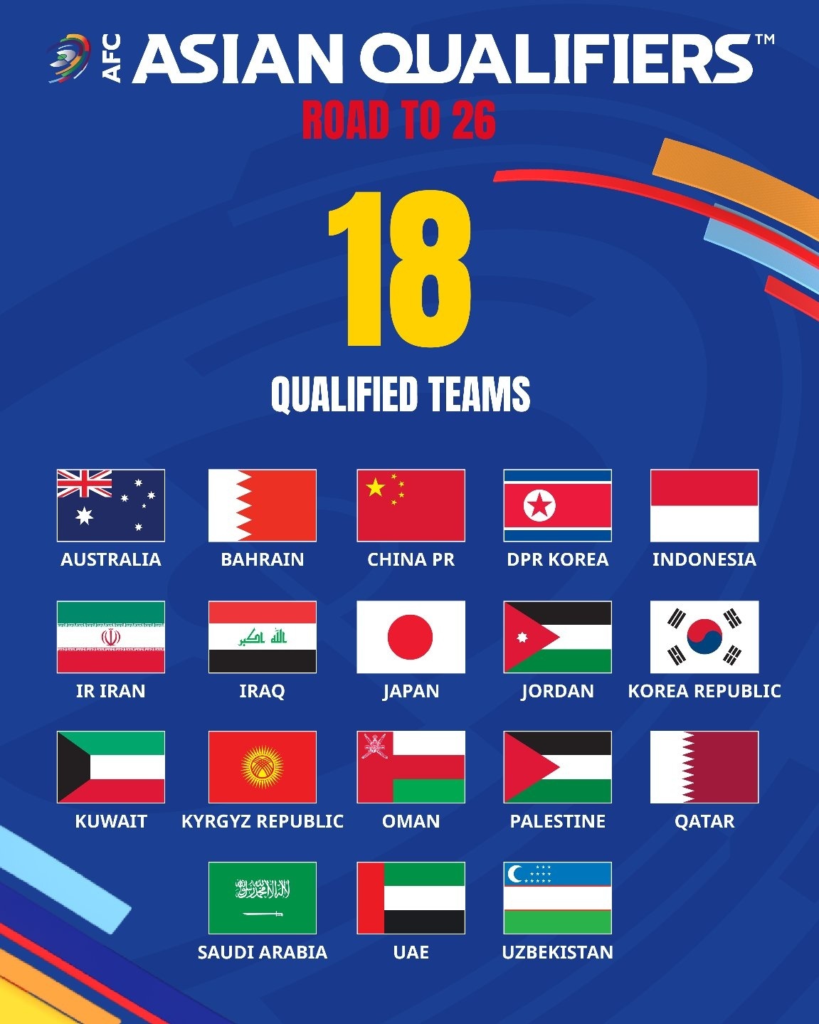 2026美加墨世界杯上,亚足联共拥有8个直接晋级世界杯的名额和1个参加附加赛的名额(即8.5个名额)。根据规则,进入第三阶段的18支球队将分为3个小组,每组6支球队,主客场双循环的10轮比赛中,每个小组的前两名共6支球队直接获得2026年世界杯的入场券。