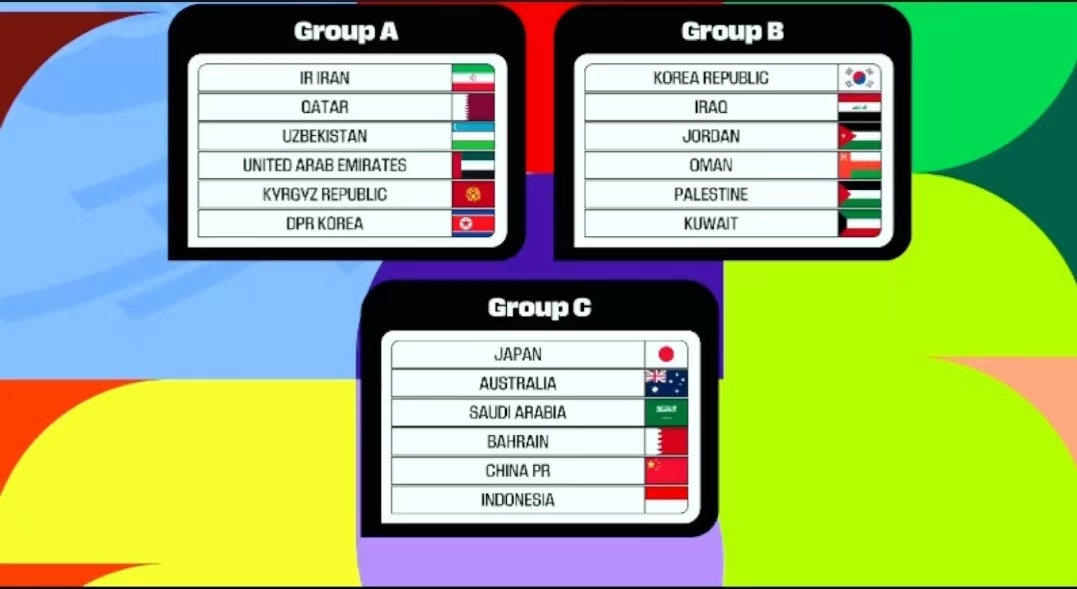 另外两个小组中,伊朗队与卡塔尔队、乌兹别克斯坦队、阿联酋队、吉尔吉斯斯坦队和朝鲜队同分在A组,而韩国队则与伊拉克队、约旦队、阿曼队、科威特队和巴勒斯坦队分在B组。