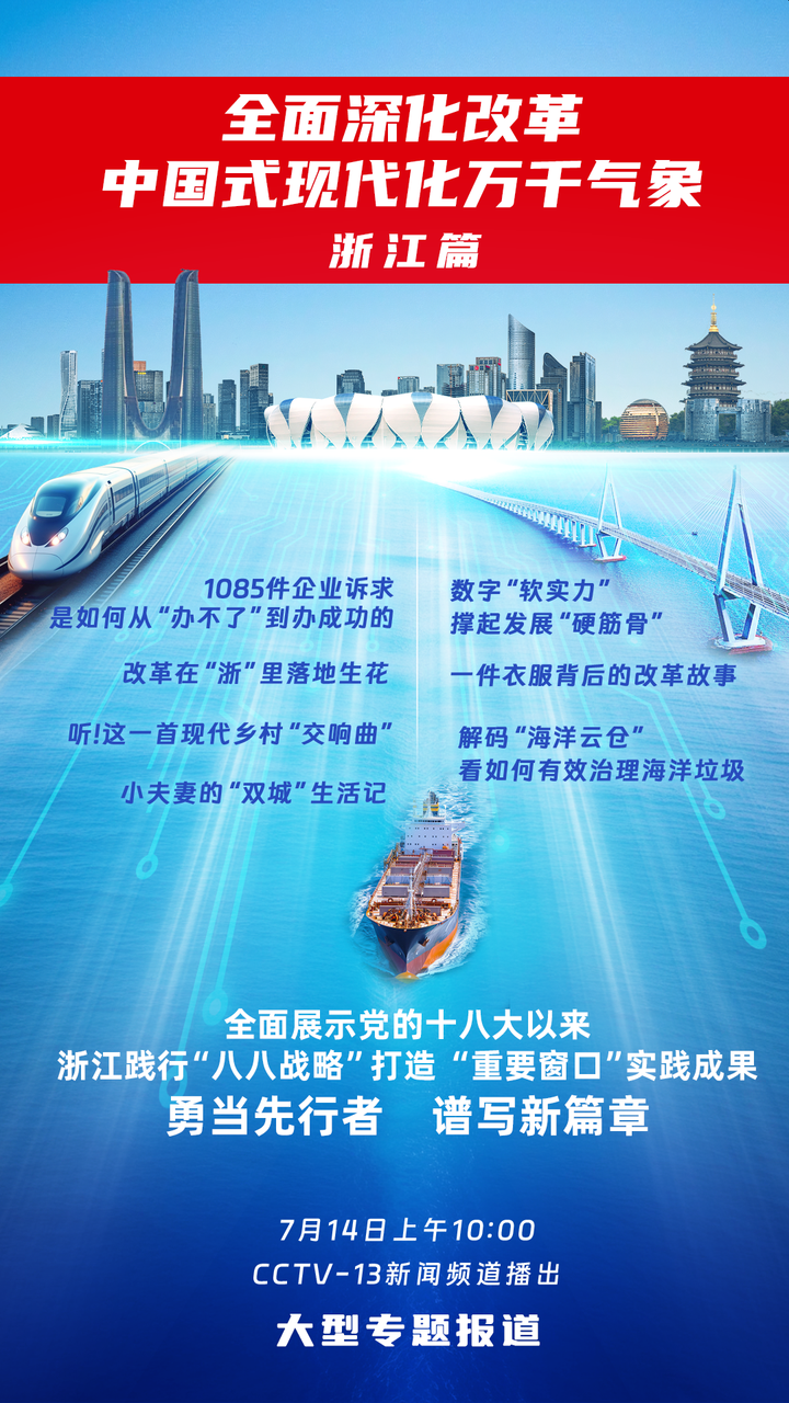 《全面深化改革 中国式现代化万千气象》大型专题报道浙江篇将于7月14日上午10点在中央广播电视总台新闻频道播出,届时,总台记者将通过互动直播和创意短片等形式全面展示党的十八大以来,浙江践行“八八战略”打造“重要窗口”的实践成果。勇当先行者,谱写新篇章,带您走进“浙”里,看变迁!