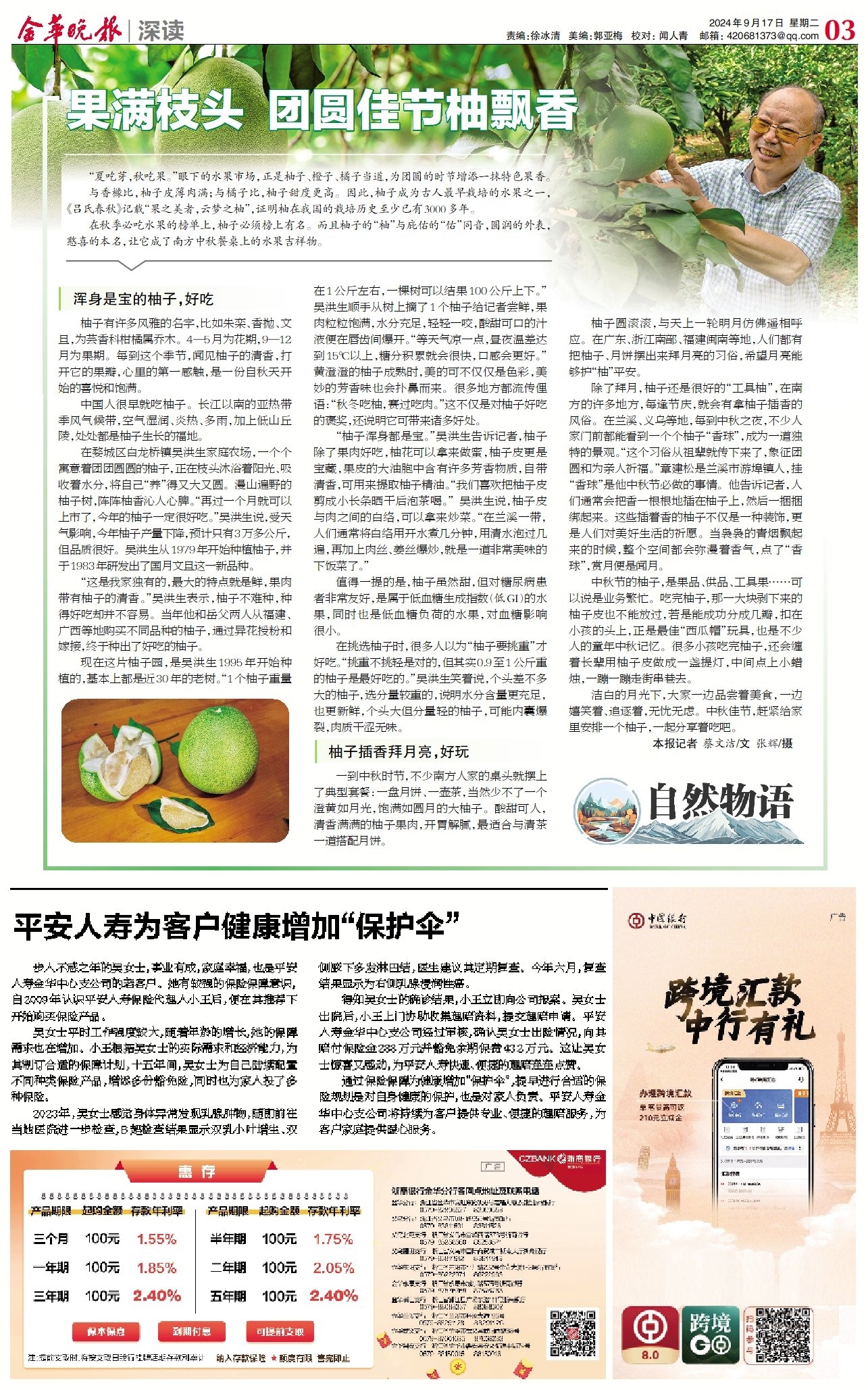 现在这片柚子园,是吴洪生1995年开始种植的,基本上都是近30年的老树。“1个柚子重量在1公斤左右,一棵树可以结果100公斤上下。” 吴洪生顺手从树上摘了1个柚子给记者尝鲜,果肉粒粒饱满,水分充足,轻轻一咬,酸甜可口的汁液便在唇齿间爆开。“等天气凉一点,昼夜温差达到15℃以上,糖分积累就会很快,口感会更好。”黄澄澄的柚子成熟时,美的可不仅仅是色彩,美妙的芳香味也会扑鼻而来。很多地方都流传俚语:“秋冬吃柚,赛过吃肉。”这不仅是对柚子好吃的褒奖,还说明它可带来诸多好处。