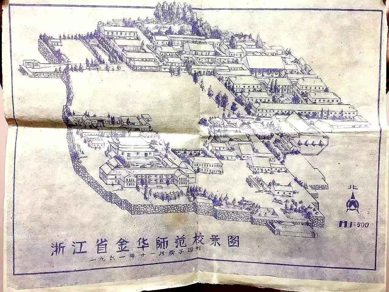 金华知名画家、金华师范学校美术老师严子固曾于1961年创作了一幅《浙江省金华师范校景图》,这张手绘图以俯瞰的视角呈现出当时古子城内的建筑布局。在图的左下方,由半圆形的泮池、双重飞檐的大成殿等建筑构成的金华府文庙建筑群清晰可见,在整幅图中显得尤为特别,可谓是当时古子城内的标志性建筑。