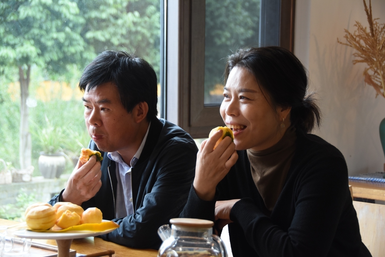 这些果实个个硕大,不少都在半斤以上。果园内,还有不少游客直接前来品尝、购买。游客们只需轻轻地刮开脆柿的表皮,就可品尝到晶莹剔透的果肉。脆柿清脆的口感让他们赞不绝口,并立刻现场下单。