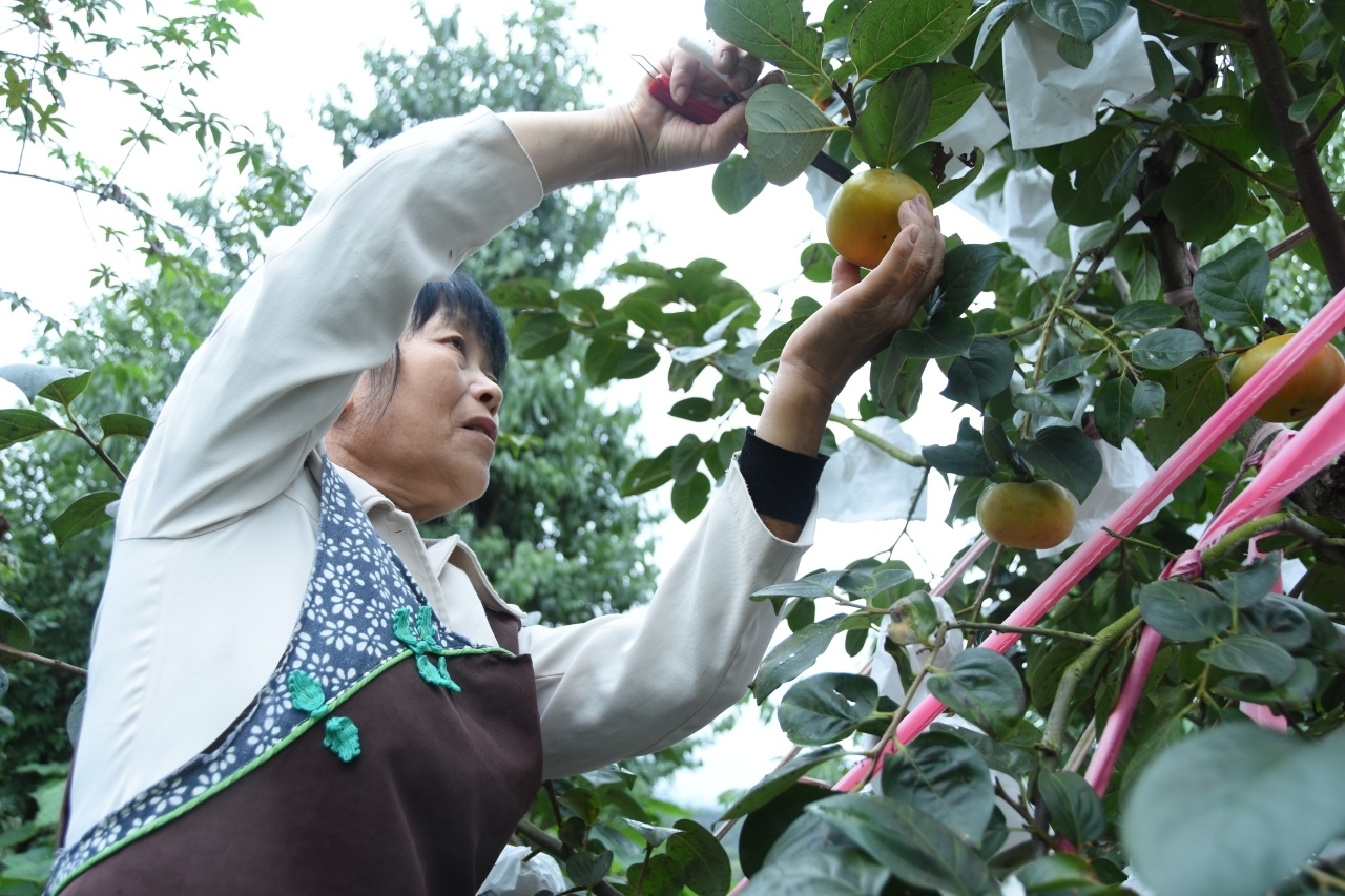 近日,武义县柳城畲族镇的老农天地果园内成片的太秋脆柿迎来了丰收。两米多高的柿子树上,挂满了圆圆扁扁的柿子。果农穿梭在园中,撕开袋子,剪下一个个黄澄澄、圆溜溜的脆柿。