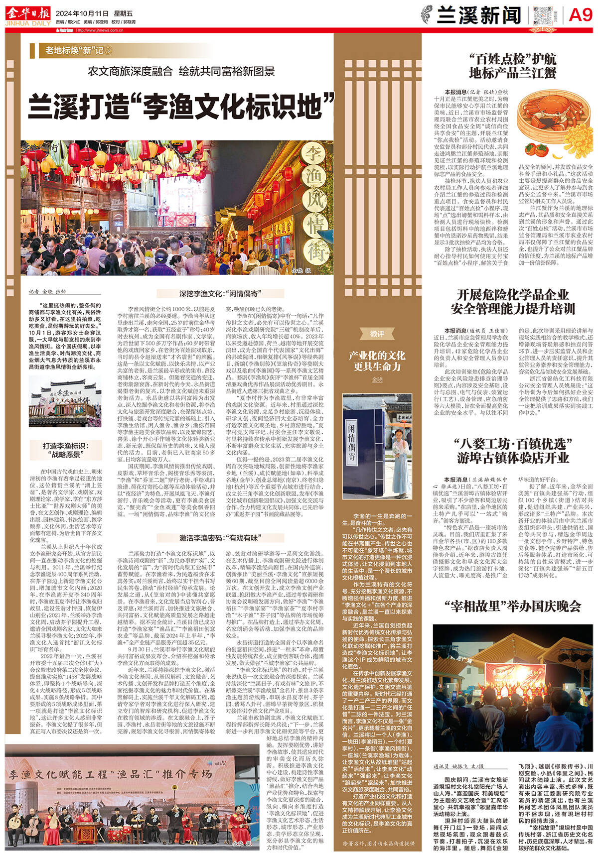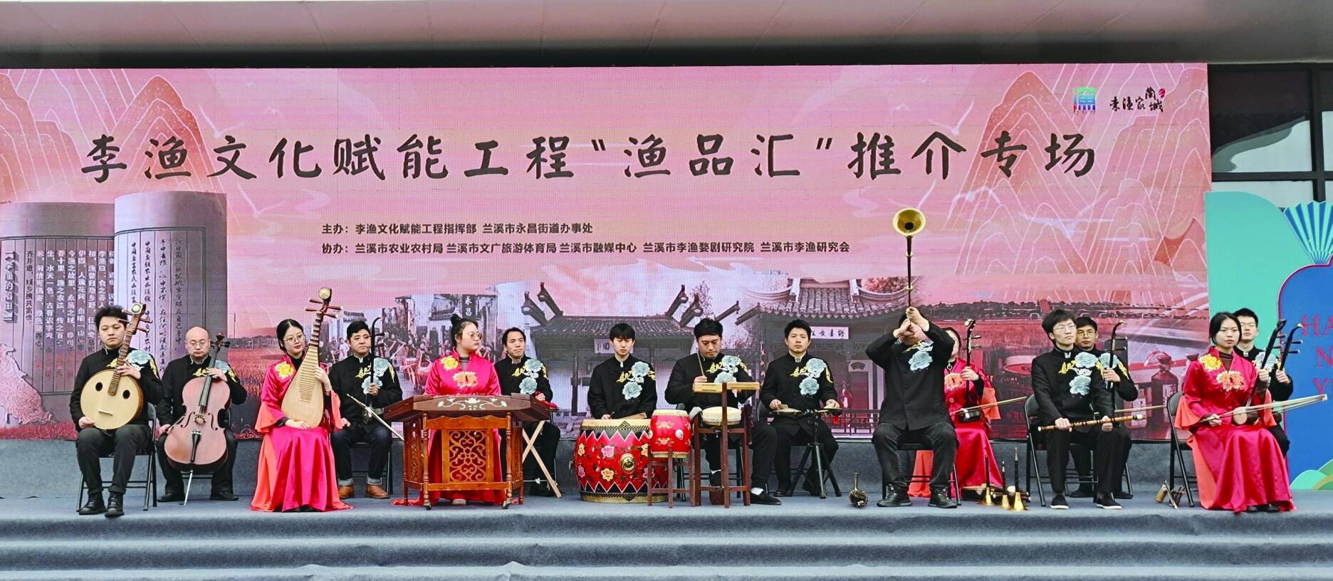 兰溪聚力打造“李渔文化标识地”,以李渔诗词戏剧的“新”、为民办事的“实”、文化发展的“富”,为“新时代典型工业城市”蓄势赋能。在李渔看来,为民造福贵在求真务实;对兰溪而言,始终以实干担当书写民生答卷,推动“治村经验”传承发展。论发展之道,从《笠翁对韵》中读懂共富愿景。在李渔看来,文化发展当启智润心、普及普惠;对兰溪而言,加快推进文旅融合、共同富裕,文化赋能高质量发展之路越走越精彩。据不完全统计,兰溪目前已成功打造“李渔家宴”“渔品汇”“李渔稻田创意农业”等品牌,截至2024年上半年,“李渔+”全产业链产品服务产值超35亿元。