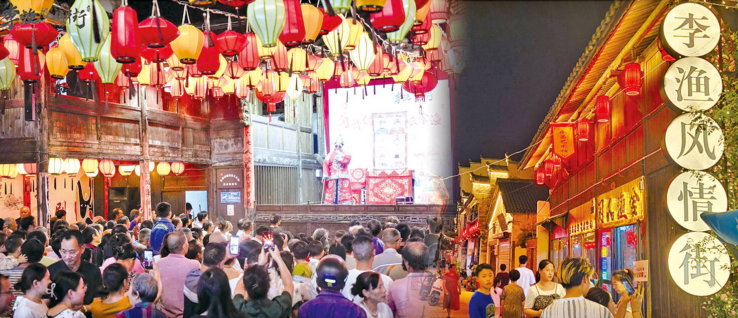 国庆期间,李渔风情街推出传统戏剧、皮影戏、草坪音乐会、阁楼音乐秀等表演,“李渔”和“乔王二姬”穿行老街、手绘戏曲脸谱、荷花灯寄托心愿等互动体验活动,并以“夜经济”为特色,开展凤凰飞天、李渔灯游行、音乐晚会等活动,更有李渔美食展览,“蟹壳黄”“金鱼戏莲”等美食飘香四溢。一场“闲情偶寄、品味李渔”的文化盛宴,唤醒沉睡已久的老街。