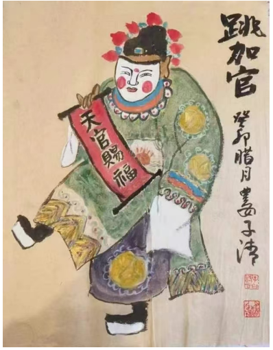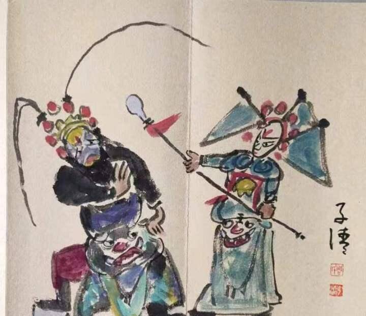 以简驭繁,以虚写实,变形取神,得意忘形,是周子清独树一帜的“周氏审美”。他的画作用笔极简,质朴平易,且不拘泥对象的解剖、透视和比例,巧妙地运用色彩与线条,勾勒出一个个鲜活的人物形象,眼睛瞳孔用浓墨点醒极传神。不仅展现了戏剧人物的外在特征,更深入挖掘了他们的内心世界。一个个生动可爱的戏曲人物在纸上“活”起来,通过笔墨表现出最唯美的瞬间及其神韵。