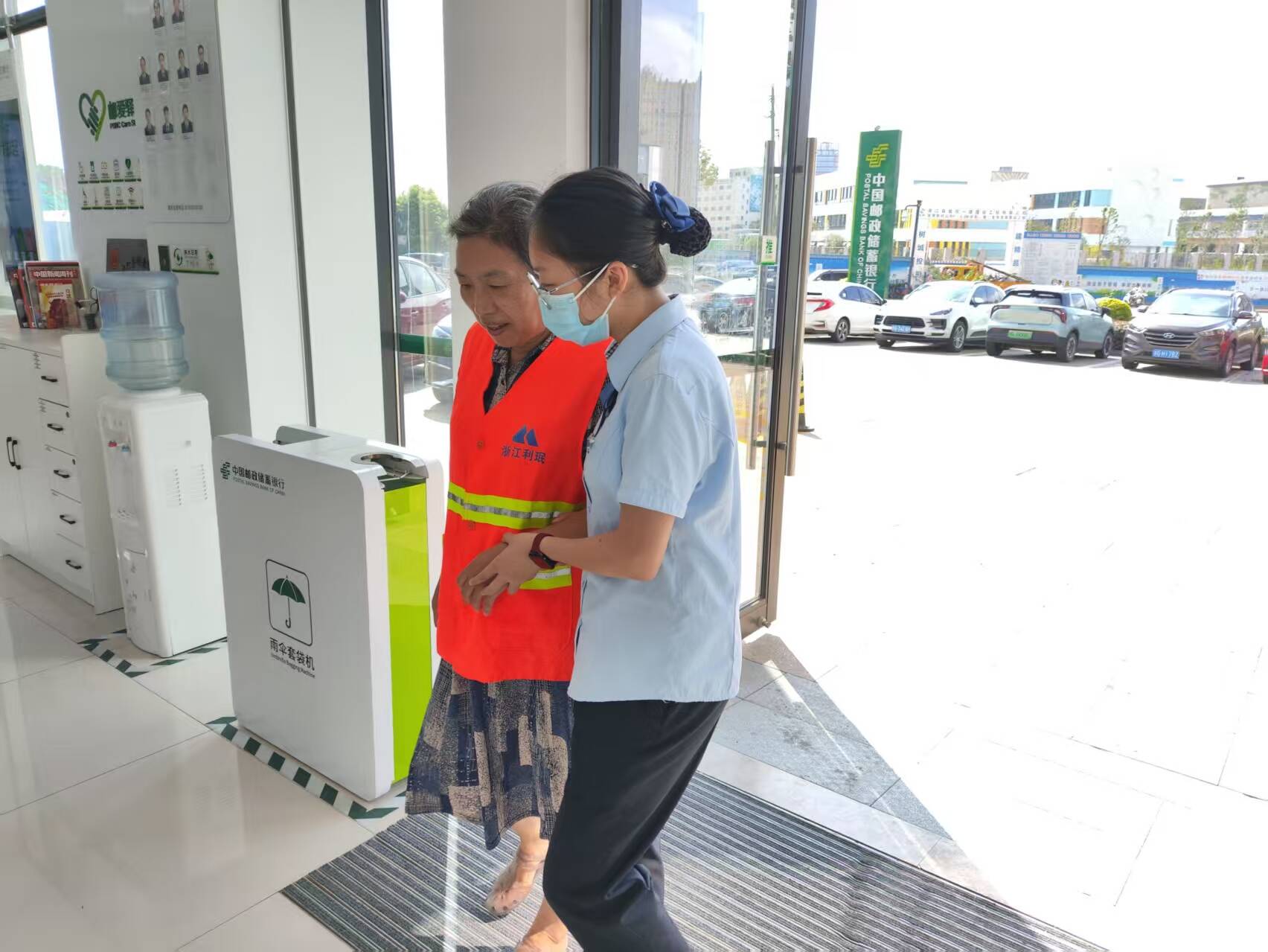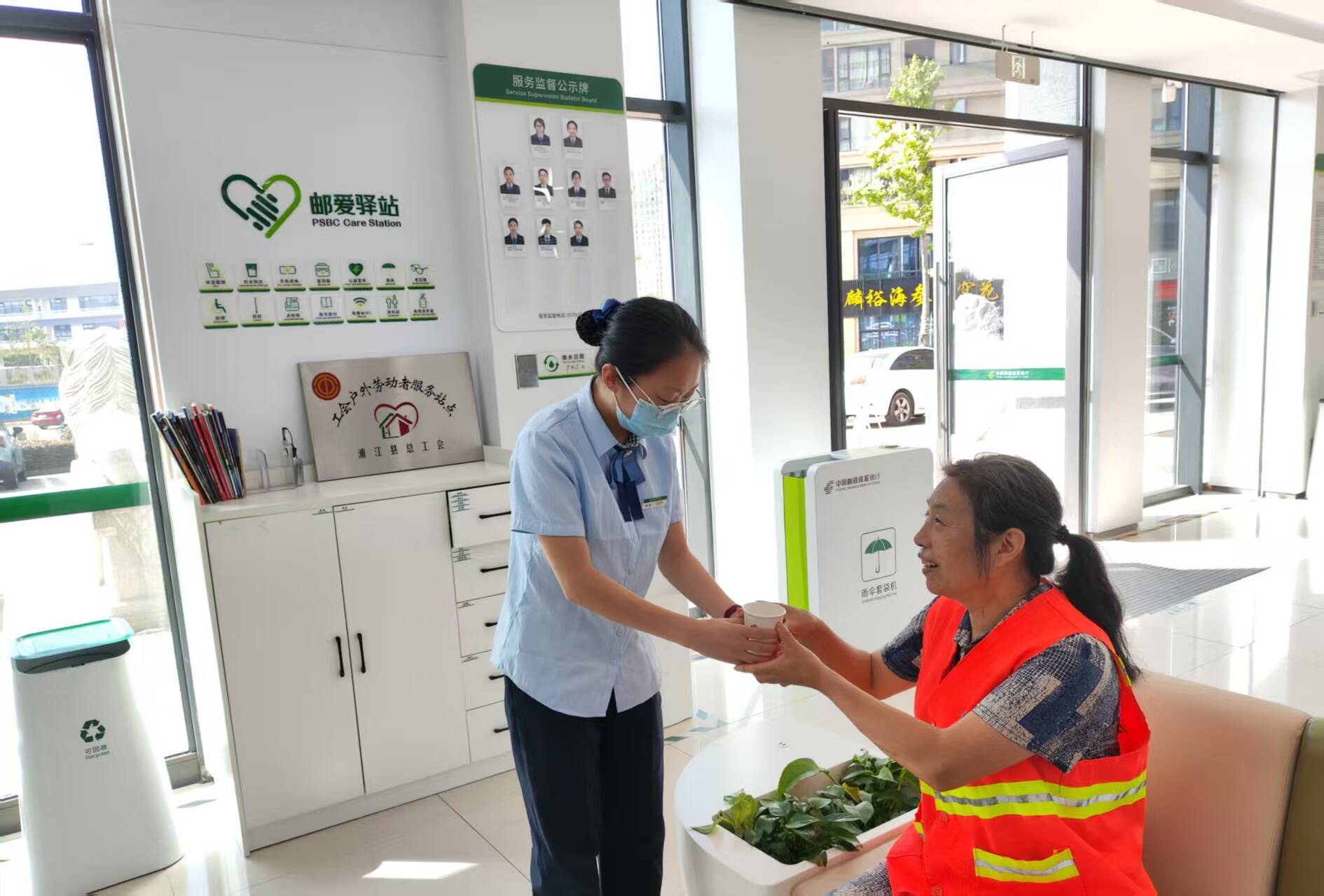 炎热的中午,一位负责街道清扫的环卫工人阿姨在户外劳作后感到头晕乏力,正坐在网点门前的花坛边休息。大堂经理第一时间注意到她苍白的脸色和不适的状态,立刻快步上前询问,并细心地将她搀扶至网点内的“邮爱驿站”休息区。