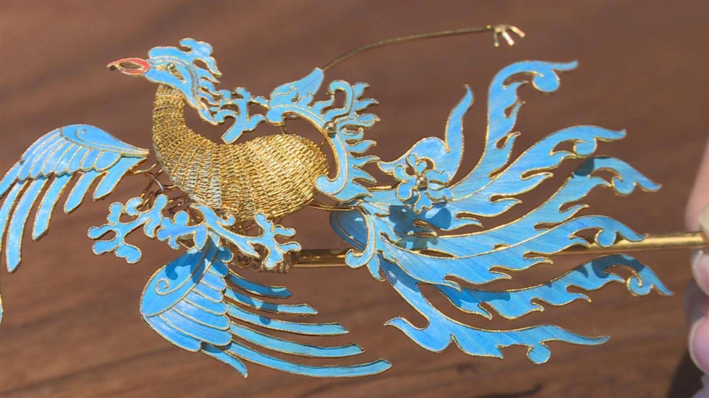 点翠是中国传统首饰制作工艺,使用翠鸟羽毛镶嵌在金属底座上,形成华丽装饰。现藏于中国国家博物馆的顶流藏品——明代孝端皇后九龙九凤冠,作为花丝镶嵌与点翠工艺的巅峰代表,受到不少人的喜爱。在金华,也有年轻人钟情和传承了这两种中国传统珠宝制作工艺,并辗转从拍卖平台拍回了许多流失海外的珍贵首饰。