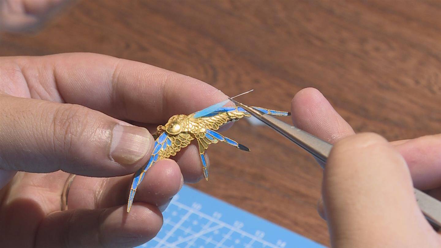 “90后”黄分回是土生土长的金华人。十五年前在杭州第一次看到点翠工艺品,就被深深吸引住了,他回忆,当时他看到的是一件凤凰发簪,在灯光下颜色非常绚丽,上面还有一颗红宝石。点翠那抹独特的光泽,一下子就击中了他的心,产生了去了解它、学会它的想法。于是,黄分回前往北京开始潜心学习点翠技艺,一待就是三年多。