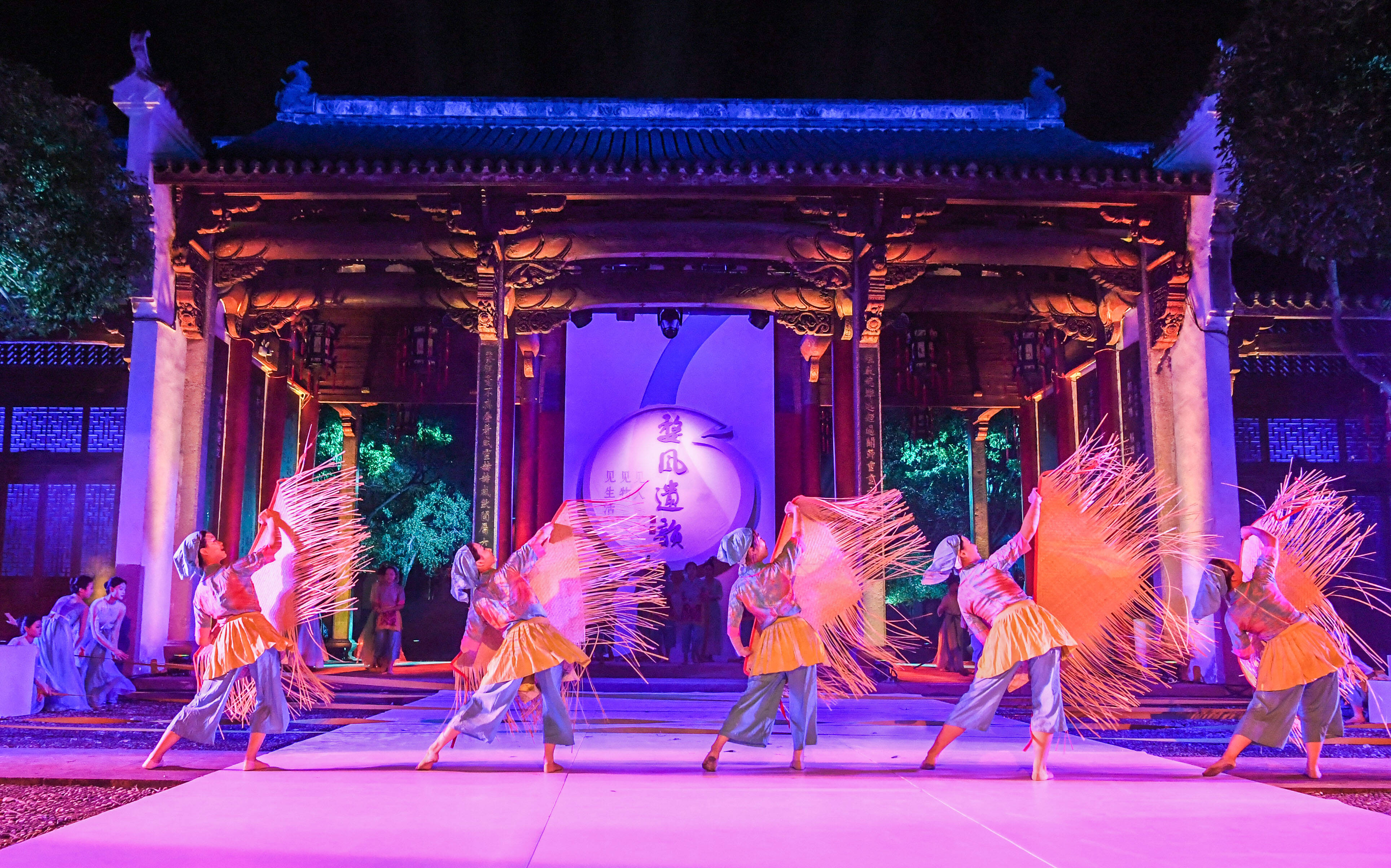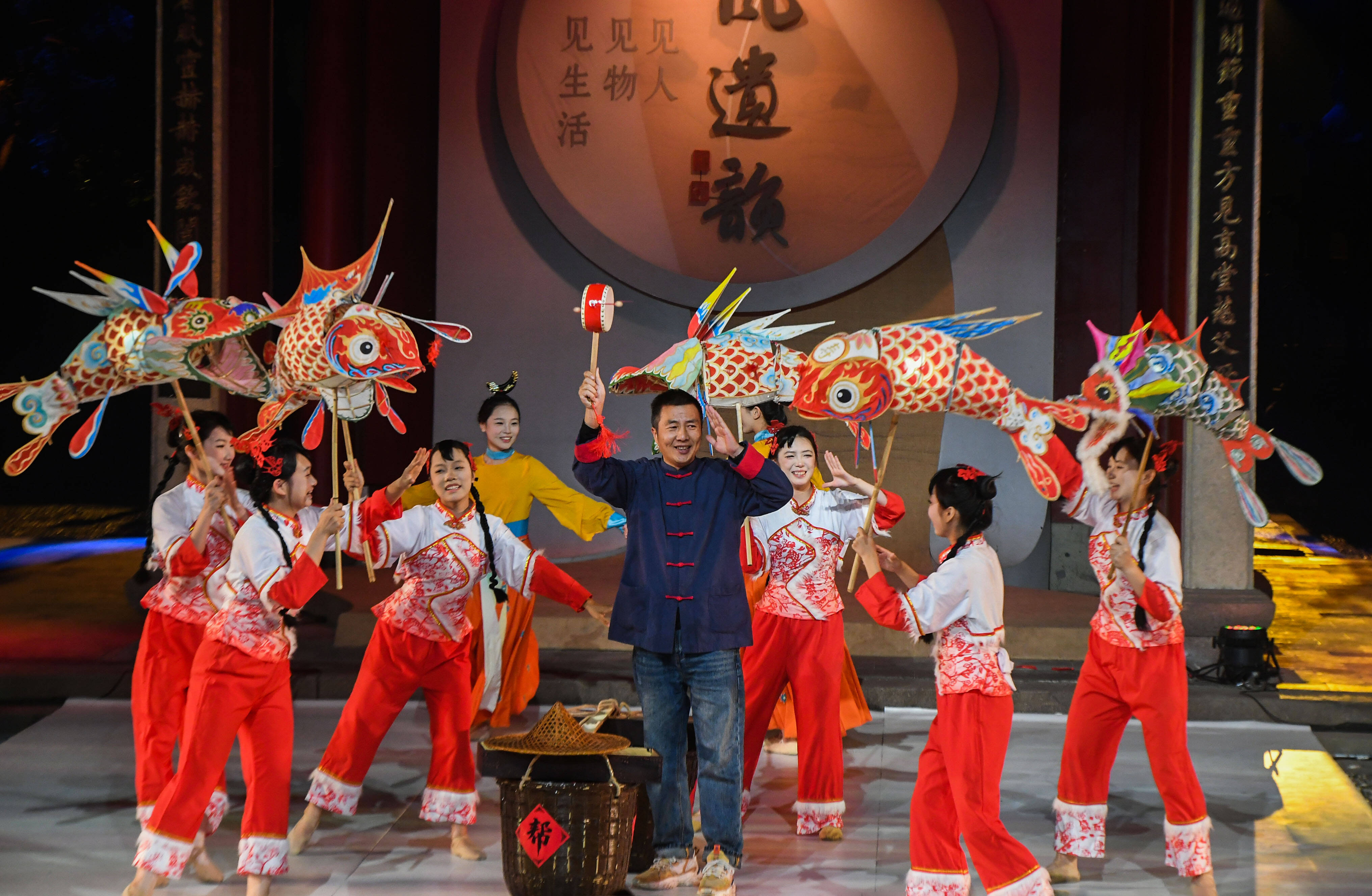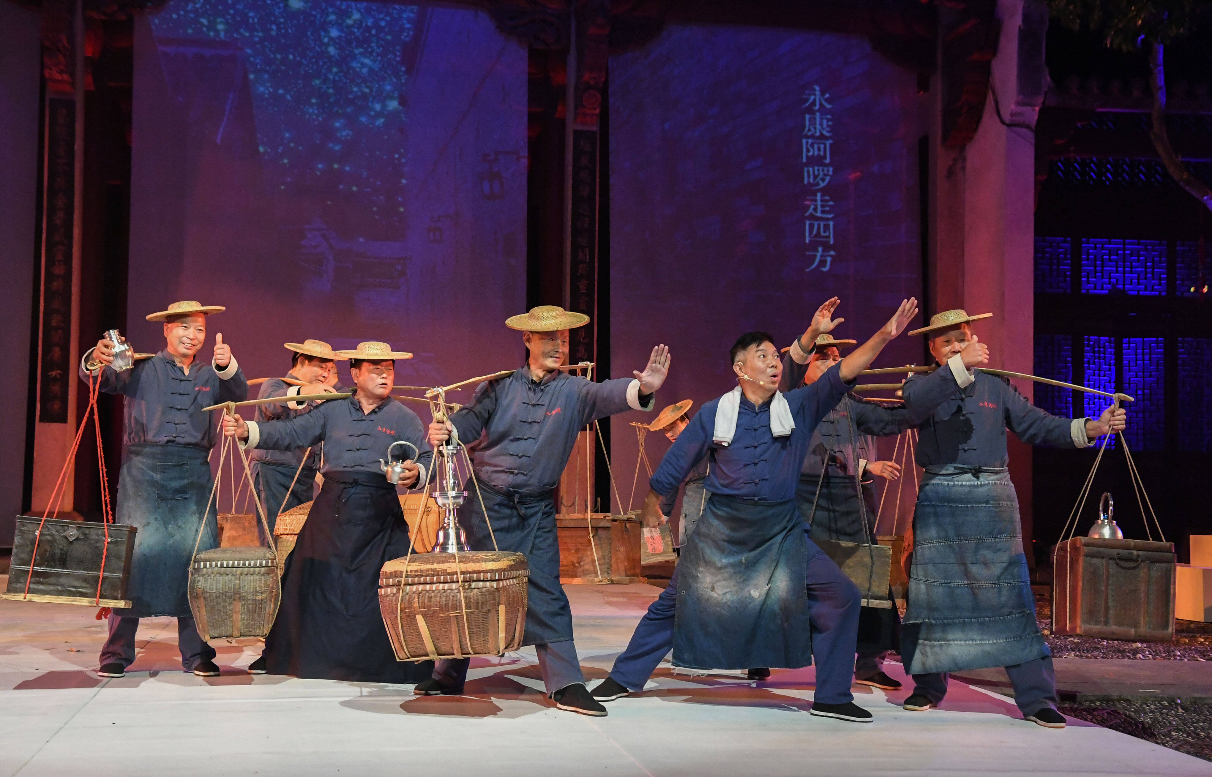 当时间来到秋天,这份秋收的喜悦要从一块婺式糕点开始品尝。舞台中央,一群“小兔子”带着用婺式传统糕点制作技艺制作的月饼走上舞台。随后,非遗舞蹈《蓝染》以素雅的白花蓝布,展现独特的艺术魅力。在永康鼓词的吟唱里,永康五金工匠肩挑行担走四方的时代印记再次上演。非遗舞蹈《窑变》则将千年婺州窑火不灭的传承故事娓娓道来。
