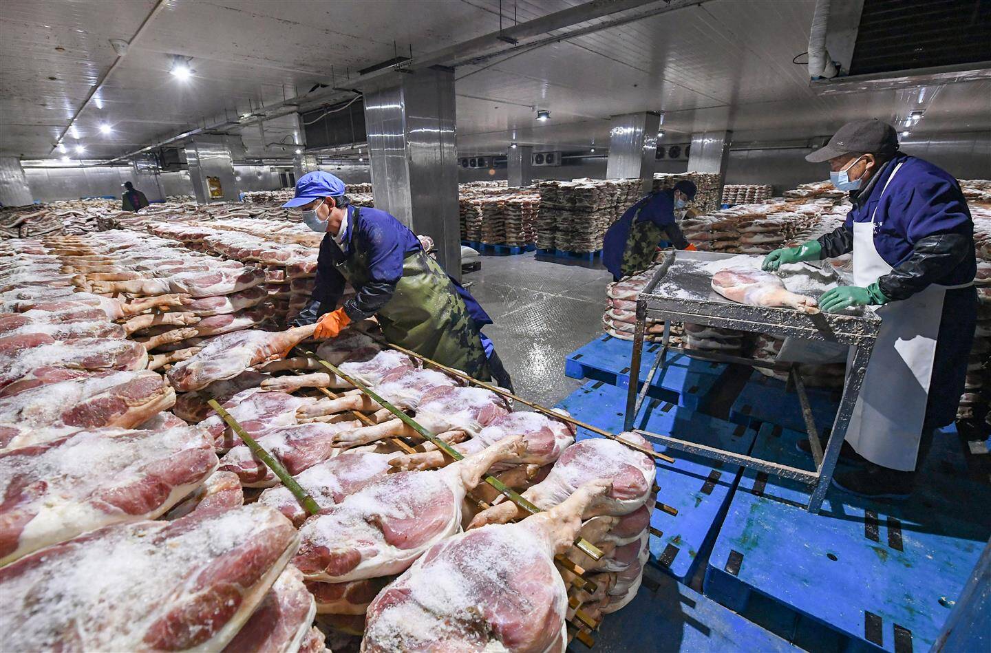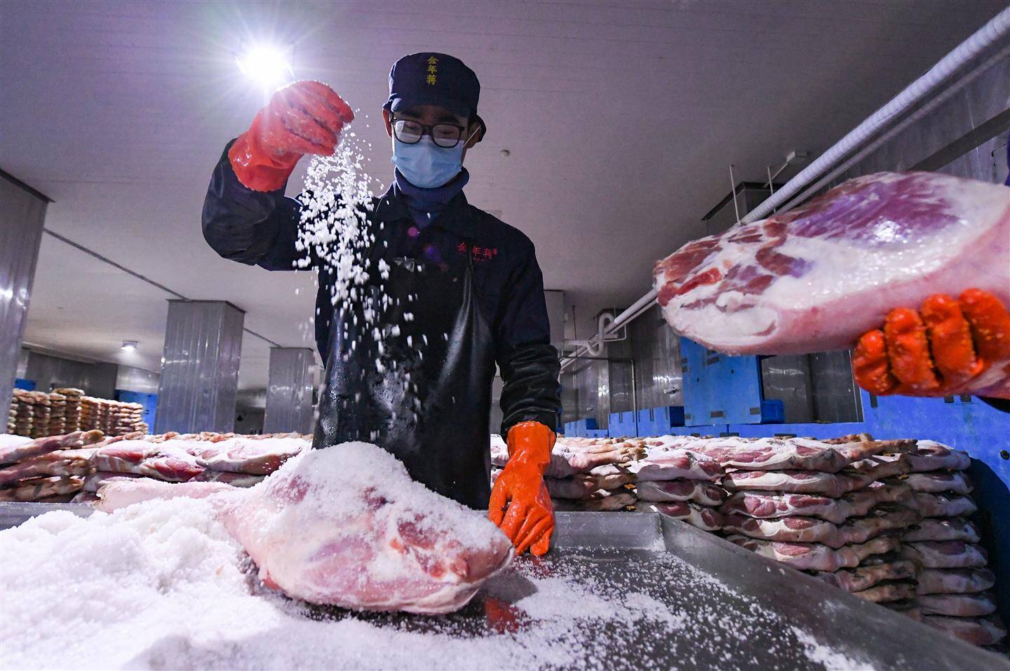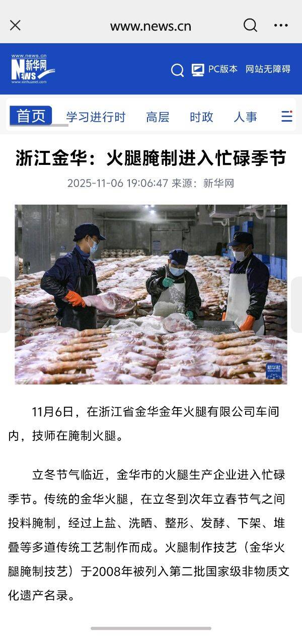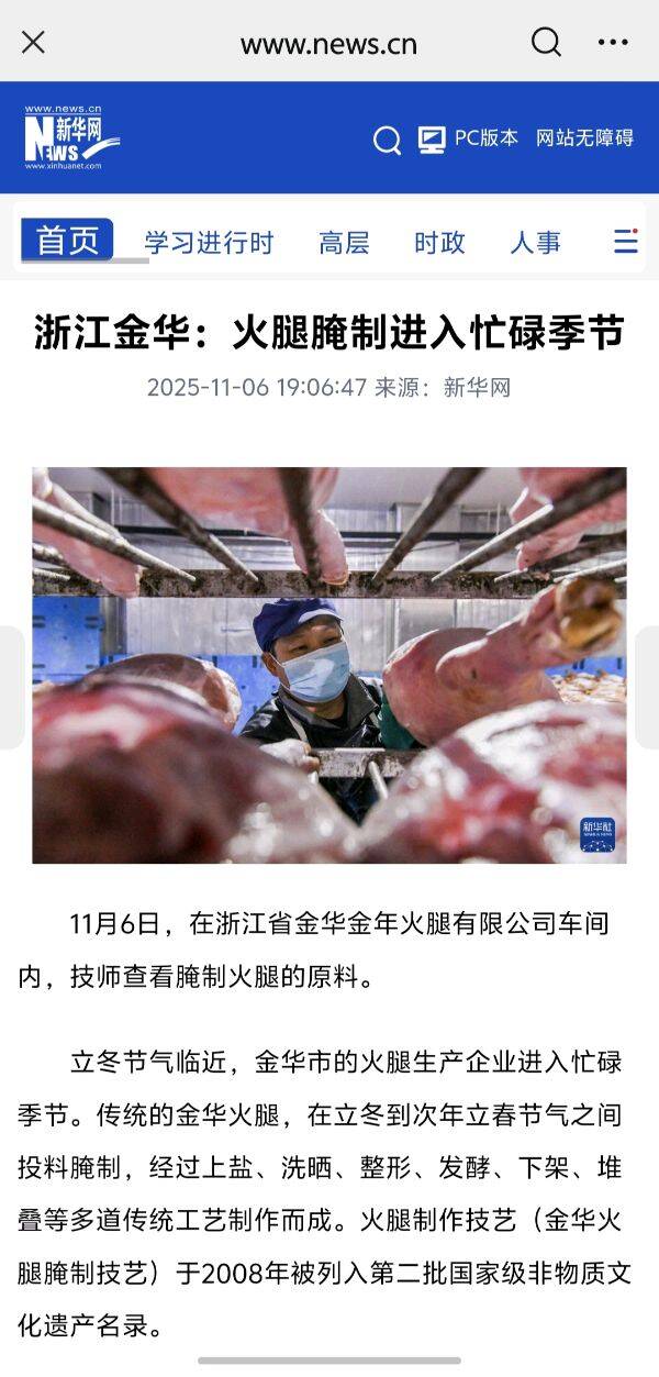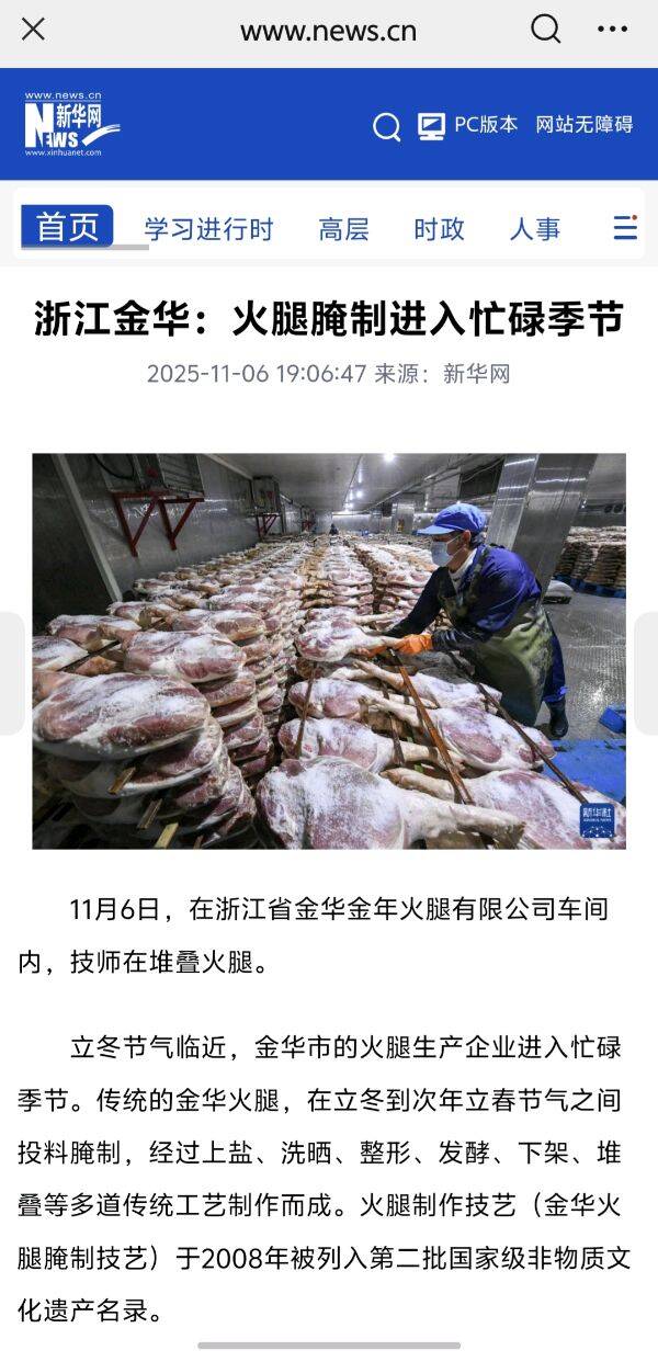 11月6日,新华社刊发稿件,关注金华金年火腿有限公司车间内,技师们在搬运、撒盐、堆叠,忙着腌制金华火腿。金华火腿在农历立冬到次年立春低温节气之间投料腌制,经过上盐、洗晒、整形、发酵、下架、堆叠等多道传统工艺制作而成,该技艺项目于2008年被列入第二批国家级非物质文化遗产名录。