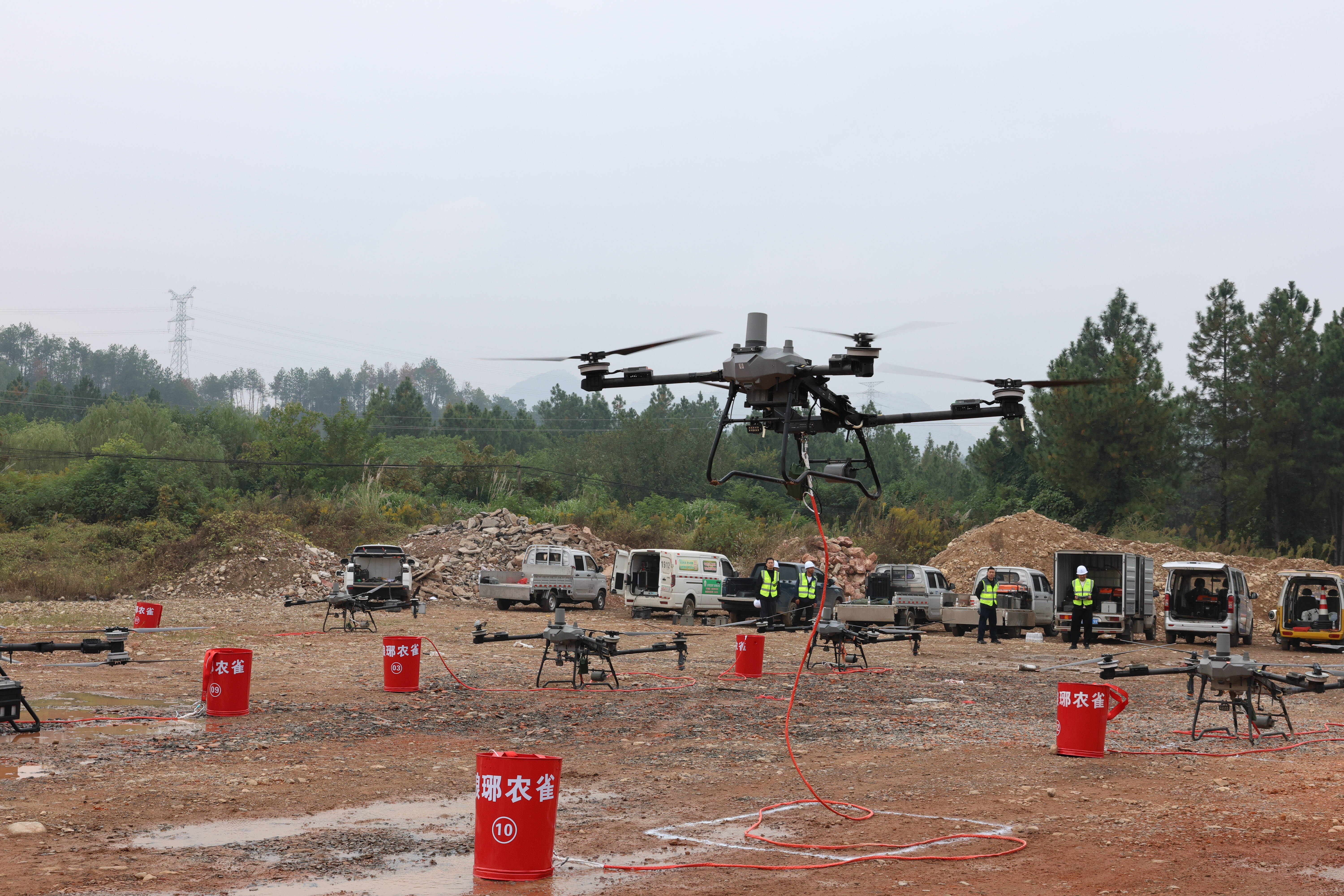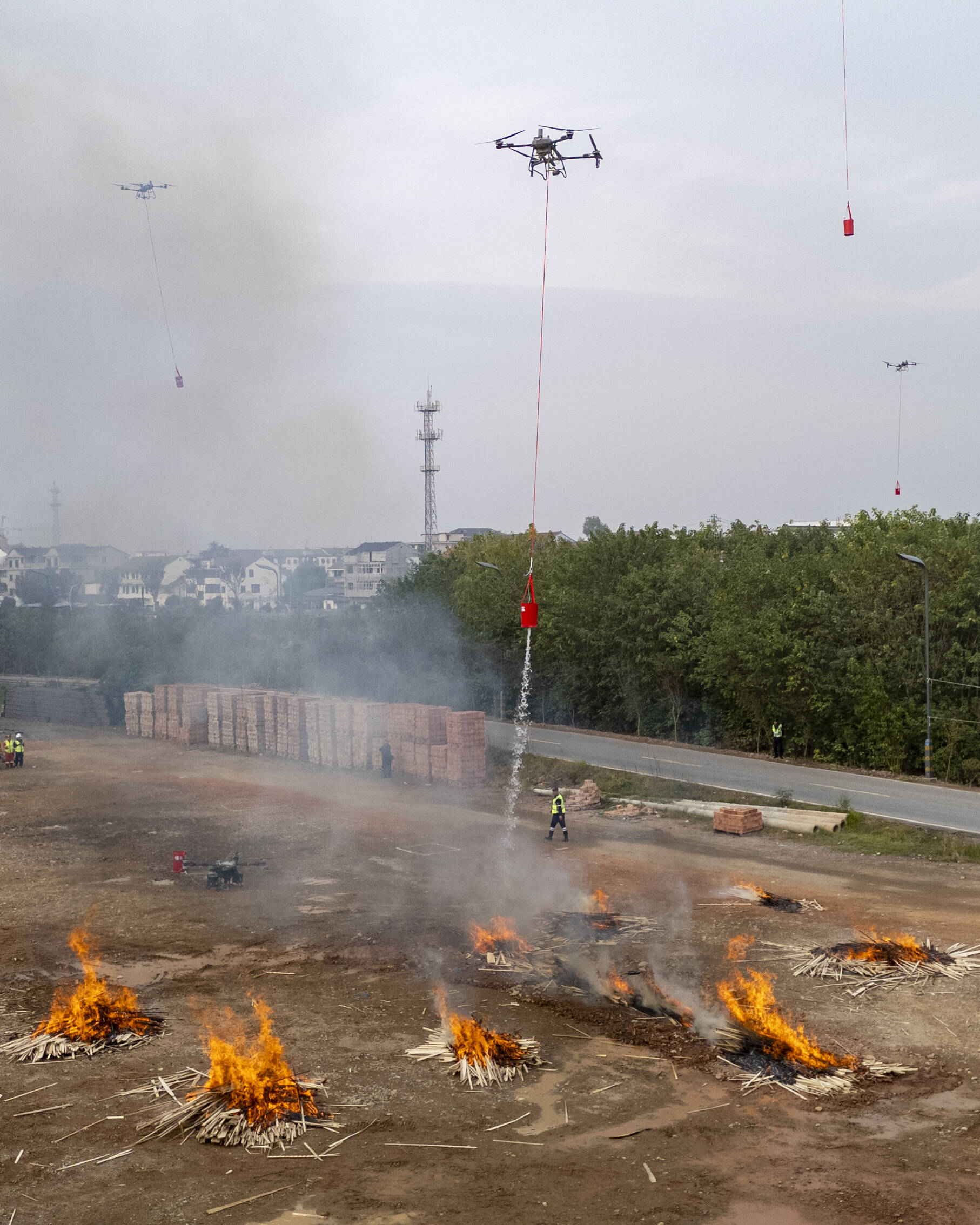 “发现火情,启动灭火!”演习现场,浓烟滚滚。只见9架无人机立即组成编队,挂载专用灭火吊桶依次飞临火场上空。随后俯冲至附近河道,自动“叼”起一桶水后,迅速拉升、转向,飞抵火场上空。在农民飞手的精准操控下,无人机悬停在火焰正上方,遥控指令一下,吊桶底部瞬间打开,70升水精准浇灌在火点中心,升腾起的大量白色水蒸气瞬间压制住火势。