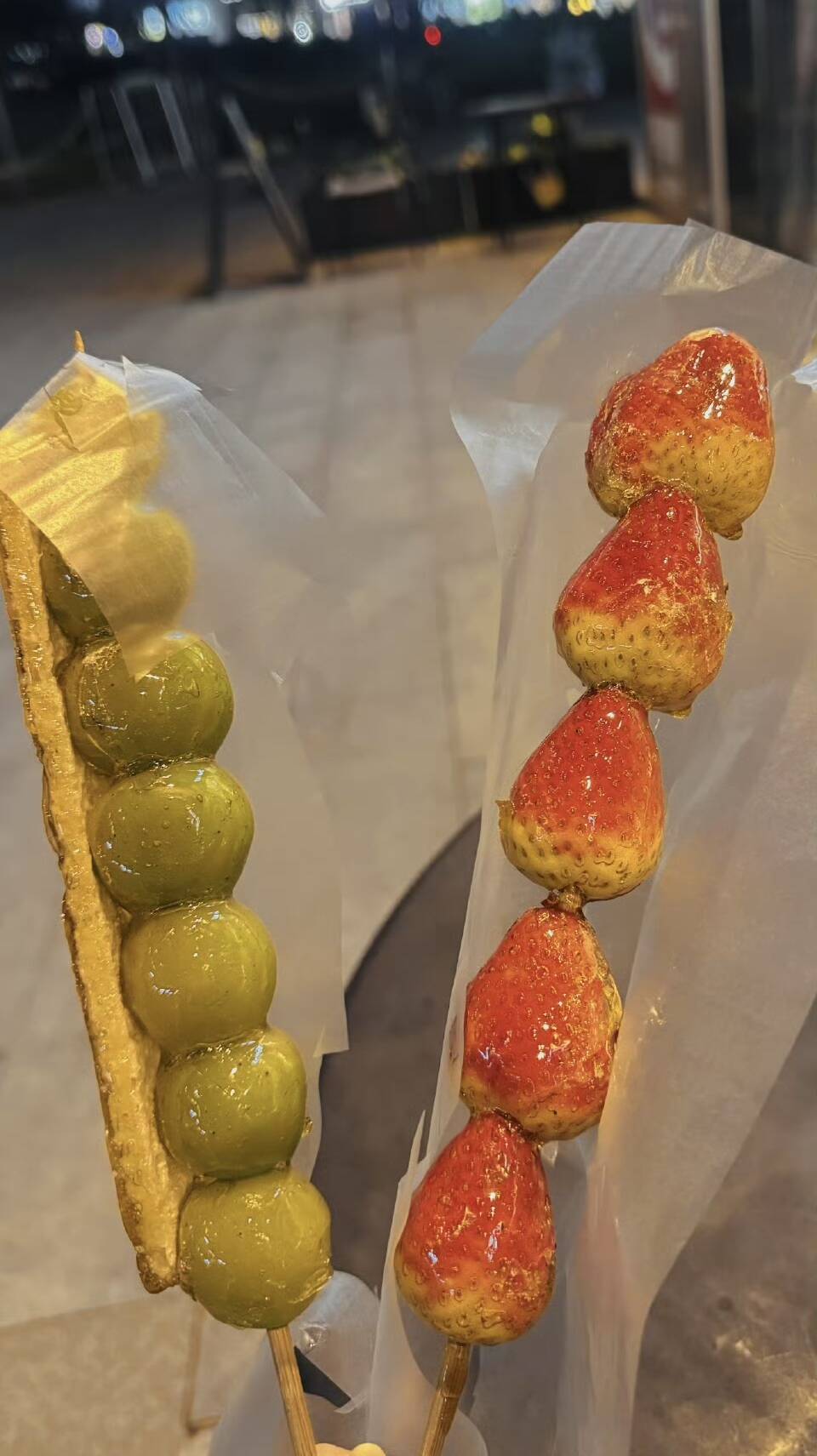夜幕降临,金华各大夜市逐渐热闹起来。记者走访看到,奶皮子糖葫芦已成为不少摊位的招牌产品。“这种扁山楂奶皮子15元一串,青提的20元。”在西市街的一个糖葫芦摊位前,摊主正向顾客介绍。正在购买的陆女士说:“孩子一放学就说要来吃这个,我也不知道是什么新流行,买一串尝尝。”她为女儿选了一串25元的草莓奶皮子,坦言价格“确实不便宜”。