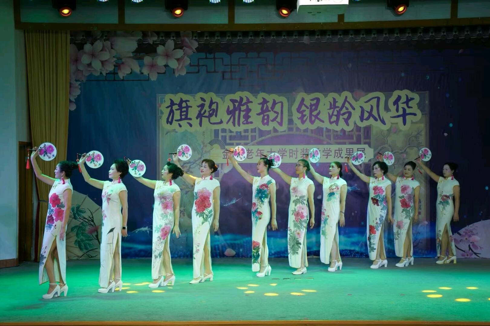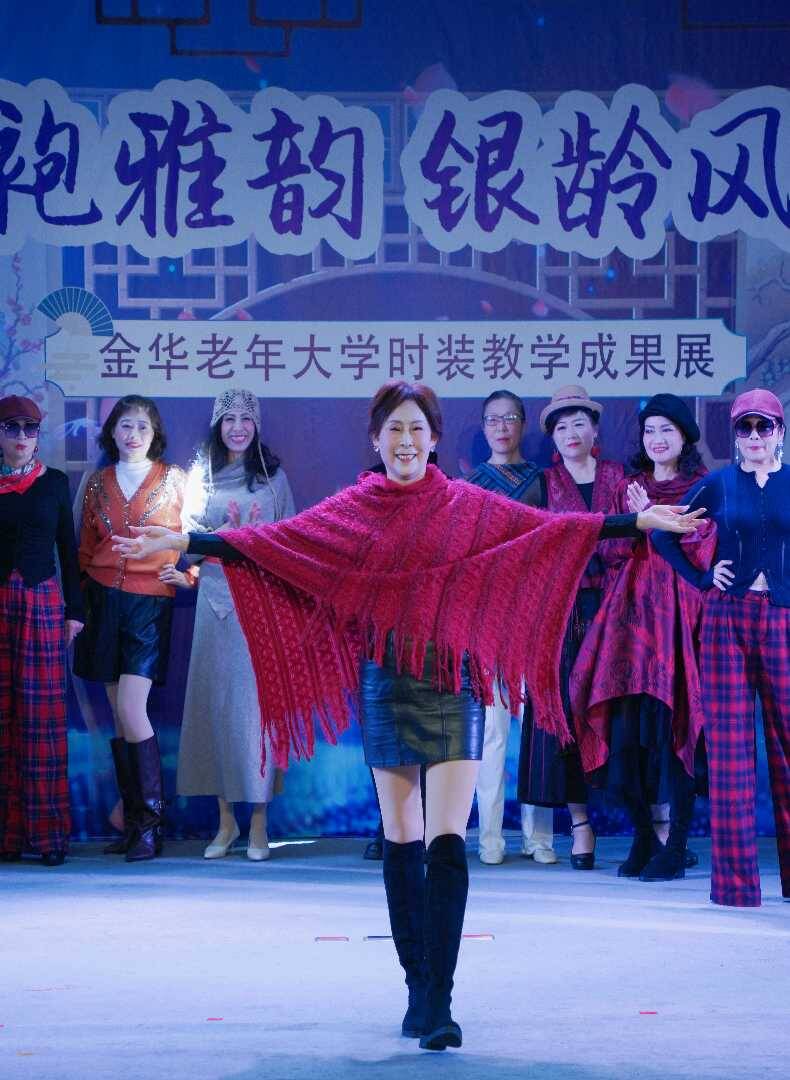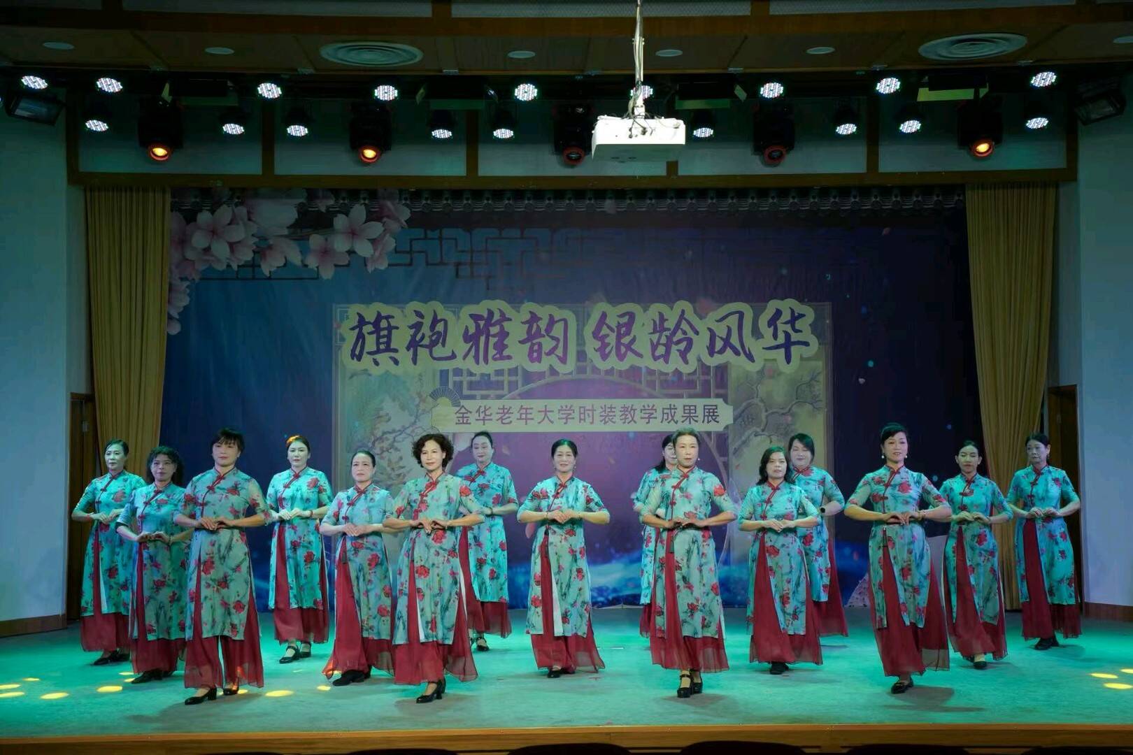 金建钢的节目编排让每个学员都能找到自己的“闪光点”。基础班学员化身“指尖舞者”,手韵表演《梦里花香》《世界赠予我的》中,柔美首饰搭配雅致服饰,一抬手、一转身,尽是岁月沉淀的温婉;表演班和东华提高班的学员则“承包”了全场高光,《国色天香》《梦里江南》等旗袍秀上,油纸伞、团扇、纱巾等道具轮番登场,东方女性的优雅被演绎得淋漓尽致;时装舞蹈《苹果香》更是创意十足,将时装走秀与舞蹈动作巧妙融合,学员们踩着轻快节拍,灵动得像一群“老顽童”;而《飒爽英姿》《侠者传说》直接打破“老年人就该温婉”的刻板印象,个性皮衣、工装风服饰上身,学员们步履铿锵、眼神锐利,妥妥的“时尚潮咖”,引得台下掌声尖叫不断;最绝的是《花开时节》,学员们的裙摆上暗藏“玄机”,金华市花茶花、特色佛手的图案随步伐摇曳,仿佛把春日花园搬上了舞台,生机盎然。