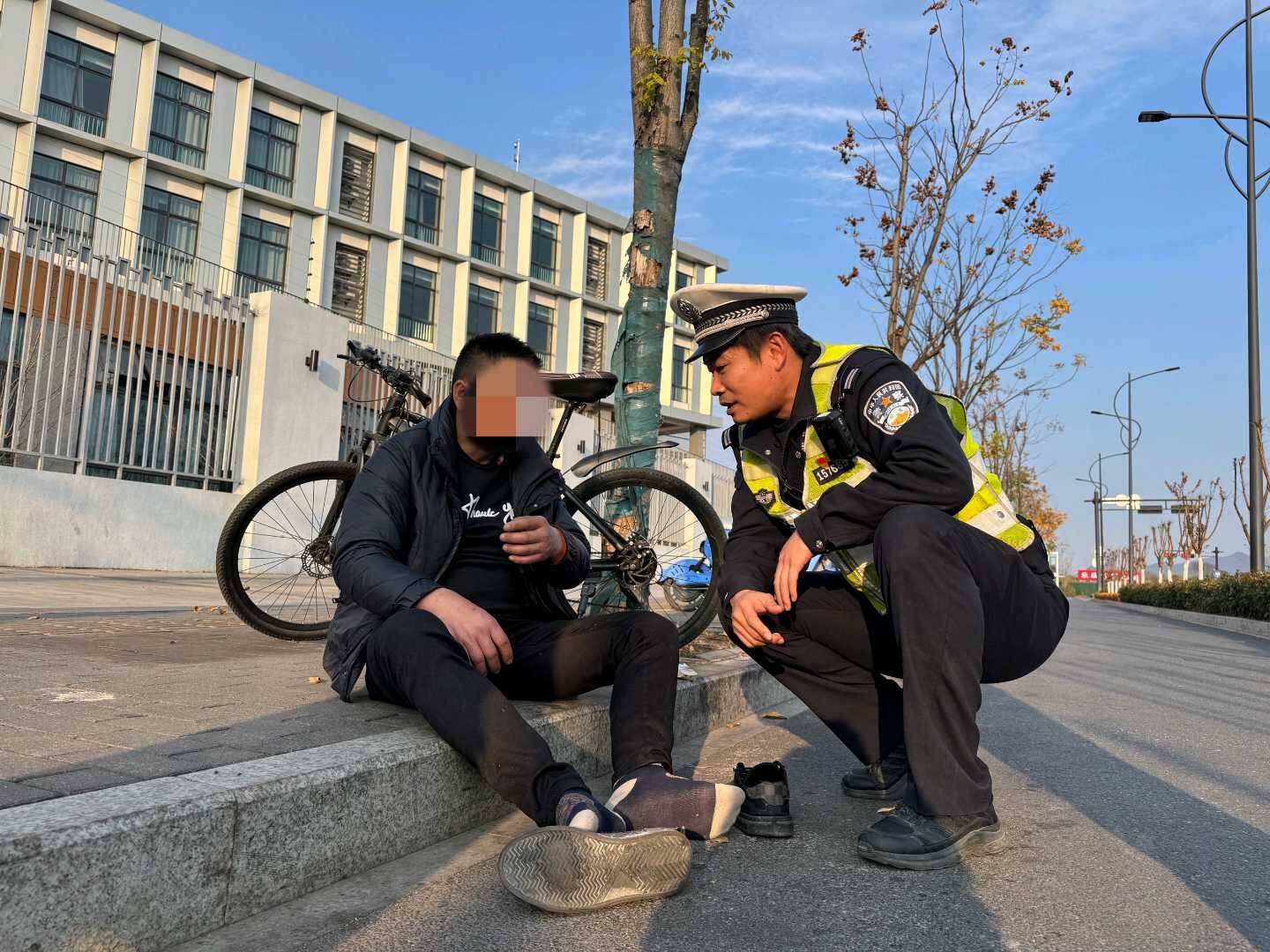 “师傅,醒醒!”民警胡善骏当即快步上前,俯身轻声呼唤。片刻后,男子缓缓坐起,一股浓烈的酒味扑面而来。胡善骏轻拍男子肩膀稳定其情绪,耐心询问身份信息及家庭情况,但男子言语含糊,仅断断续续告知自己是贵州来兰溪的务工人员,其余信息难以听清。