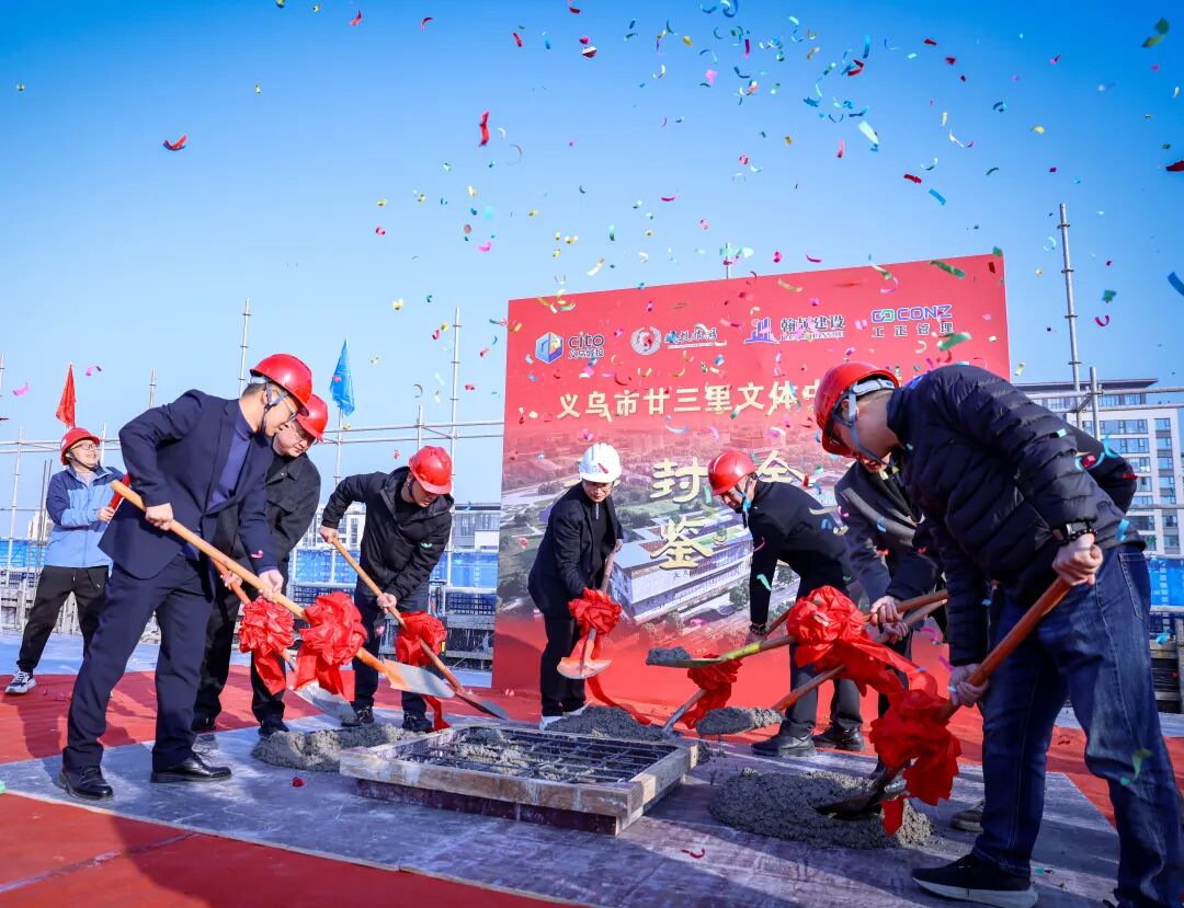 1月16日,廿三里文体中心项目主体结顶。义乌城投旅游公司、城投社会事业公司、项目施工及监理单位等代表出席,为主体结构封顶浇筑最后一方混凝土,见证这一重要里程碑。