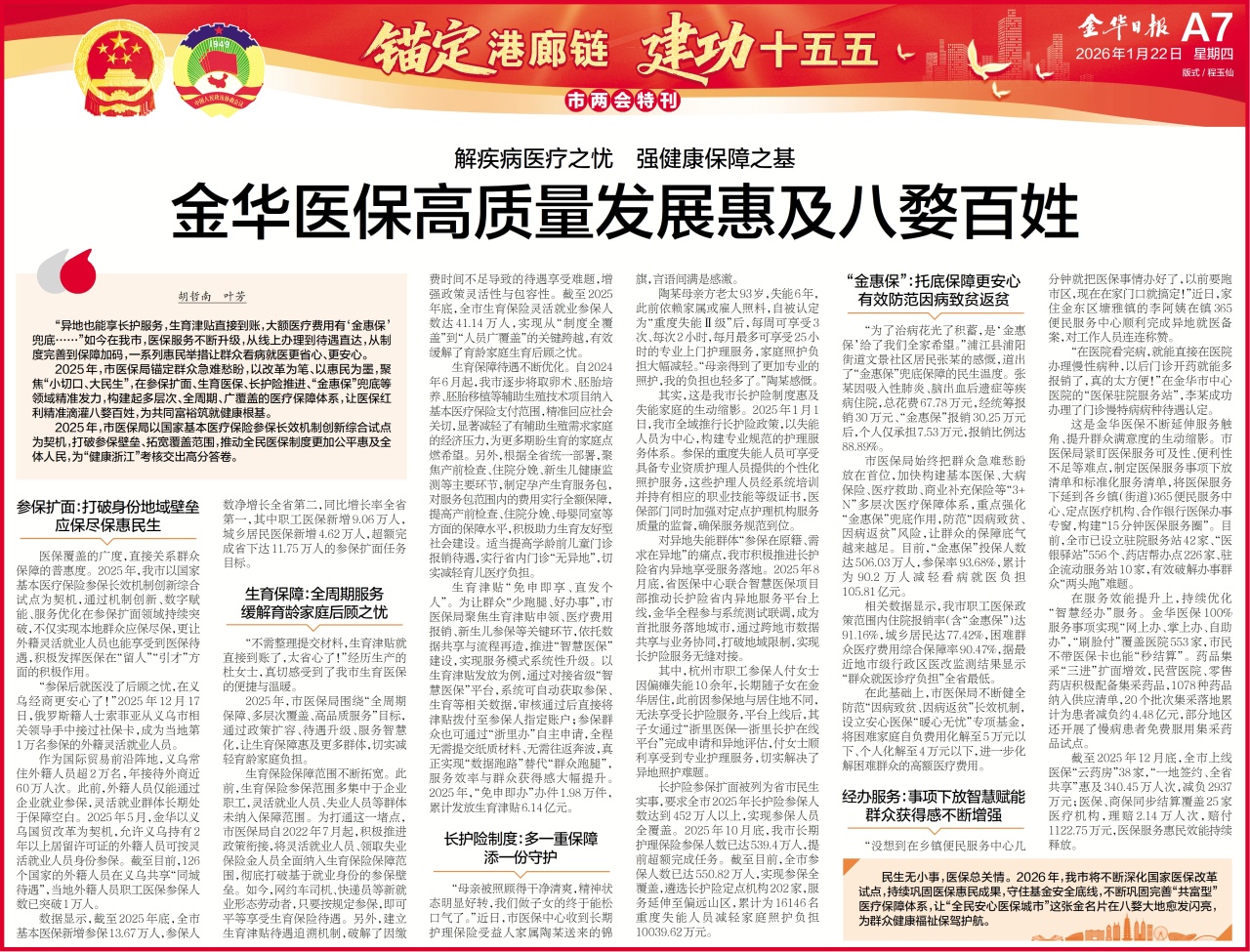民生无小事,医保总关情。2026年,我市将不断深化国家医保改革试点,持续巩固医保惠民成果,守住基金安全底线,不断巩固完善“共富型”医疗保障体系,让“全民安心医保城市”这张金名片在八婺大地愈发闪亮,为群众健康福祉保驾护航。