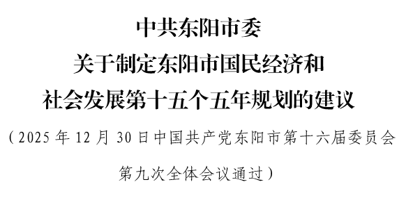 中国共产党东阳市第十六届委员会第九次全体会议,认真学习贯彻党的二十届四中全会精神,根据省委十五届八次全会和金华市委八届九次全会决策部署,就制定我市国民经济和社会发展“十五五”规划提出以下建议。
