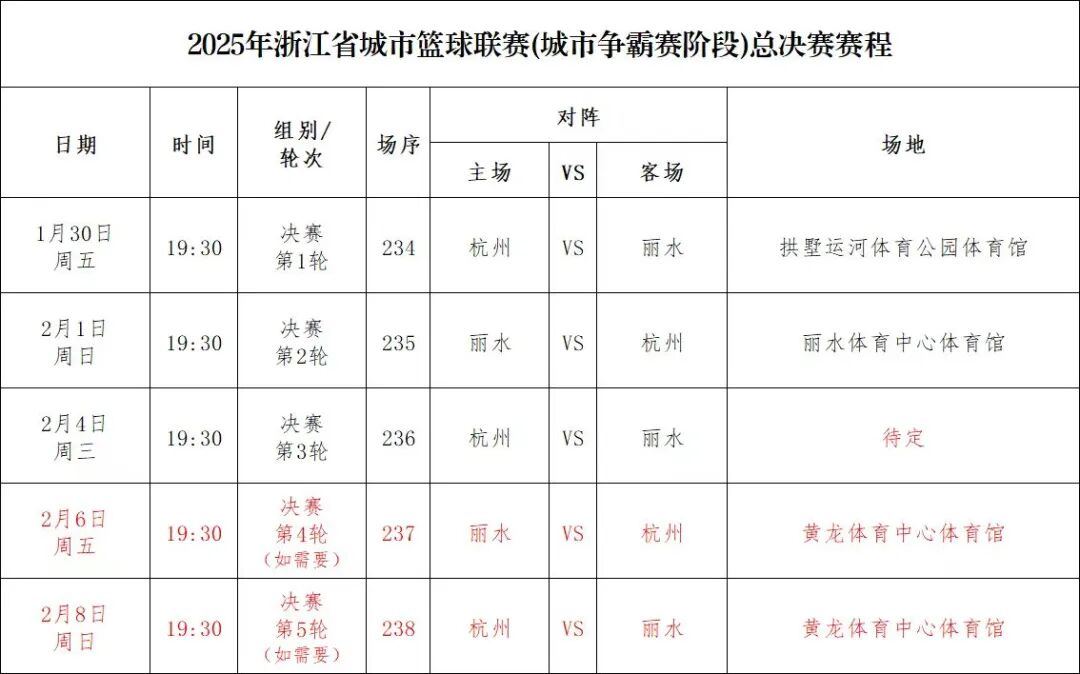 1月24日,“浙BA”赛事组委会发布了总决赛赛程,总决赛将采取5场3胜制。