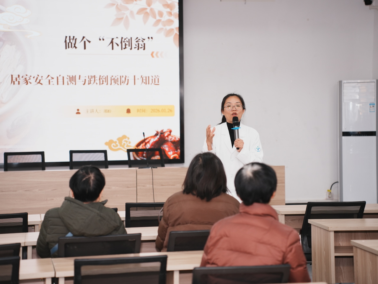 预防跌倒,不能止于一次检查。本次活动重点推出了“居家跌倒风险管理”的闭环宣教服务。医院跌倒小组现场授课,针对居家环境评估与个性化改造提供专业建议——“灯光亮度够不够”“卫生间是否需要加装扶手”,护士们不仅手把手教老人排查隐患,还融合中医小组现场教授养生操,让预防跌倒从一次性的科普转变为持续、专业、有陪伴的健康管理过程。