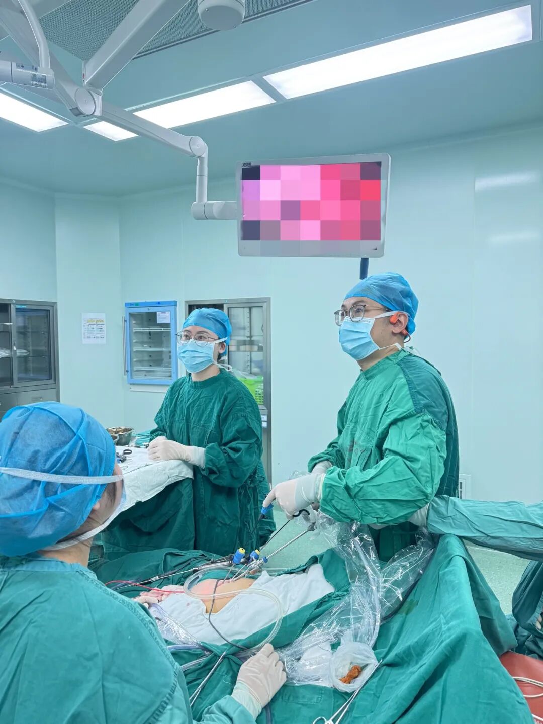 手术由儿外科主任胡东来带领团队完成。术中仅在下腹部做了三个分别是5mm、3mm和3mm的微小切口,利用腹腔镜的高清放大视野,精准地进入膀胱(建立气膀胱工作空间),在狭小的盆腔空间内,精细地游离输尿管、切除输尿管狭窄段,并巧妙地将其重新吻合于膀胱对侧输尿管开口附近,同时构建了抗返流的黏膜下隧道,以符合正常生理。整个手术过程出血极少,操作精准,有效保护了膀胱周围重要组织和神经。