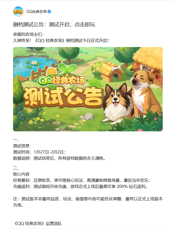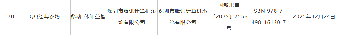 记者发现,在2025年12月公布的国产网络游戏审批信息中,移动端的腾讯《QQ农场》就获得了版号。2026年1月27日—2月2日,《QQ经典农场》开启了删档测试,这次回归的经典版本,被网友认为是原汁原味的情怀复刻。