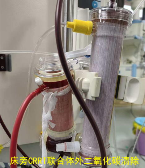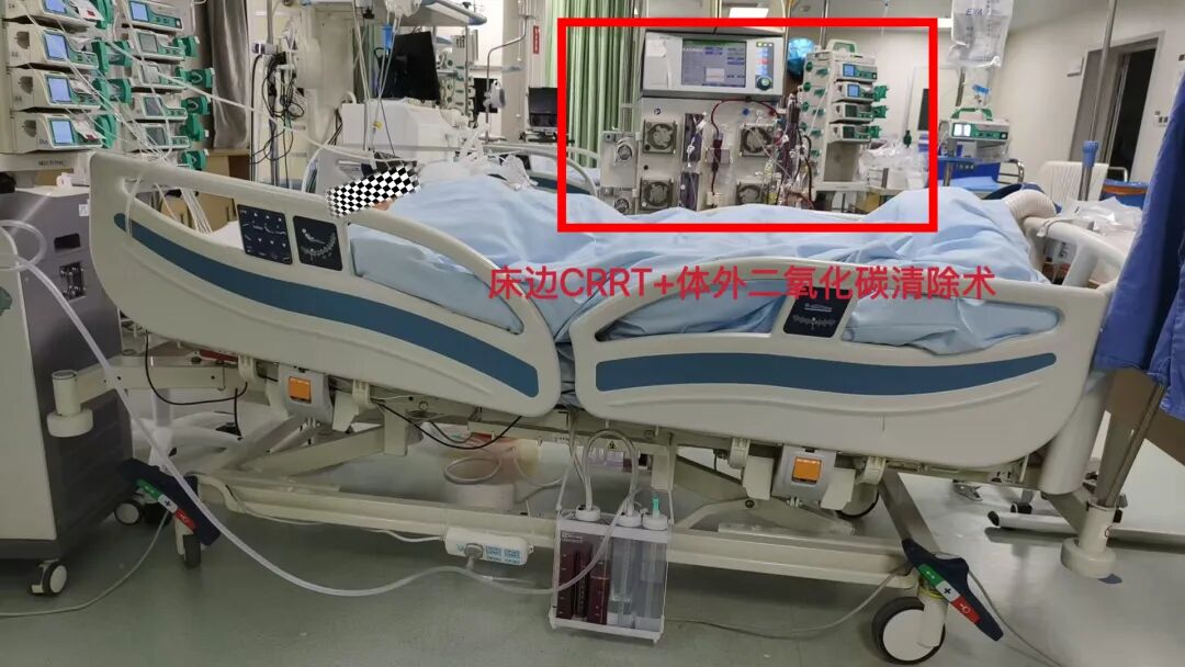 ECMO支持因创伤大出血有禁忌,EICU团队经严密评估,决定采用CRRT提高血流量串联ECCO₂R(体外二氧化碳清除技术)。