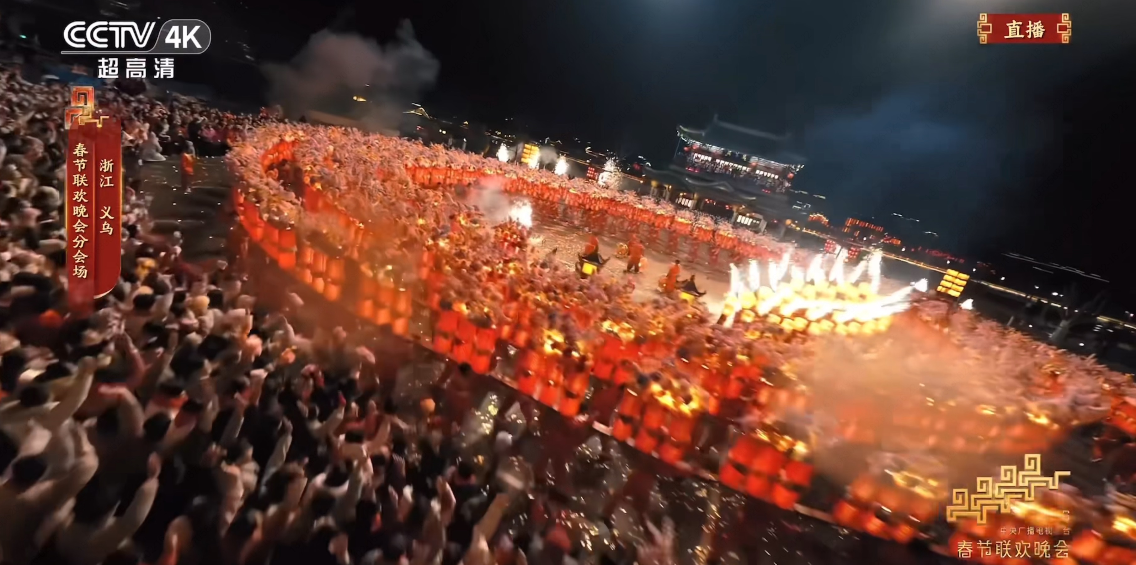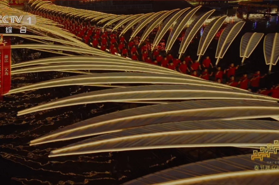 此外,春晚义乌分会场的镜头中,还多次出现舞龙灯的场景,包括在佛堂古镇上演的300多节板凳龙盘龙灯,十分壮观,过年的仪式感拉满。而这些充满烟火气、红火热闹的新春民俗、非遗文化亮相春晚舞台,充分展现了浙江的人文之韵、发展之兴、生活之美。