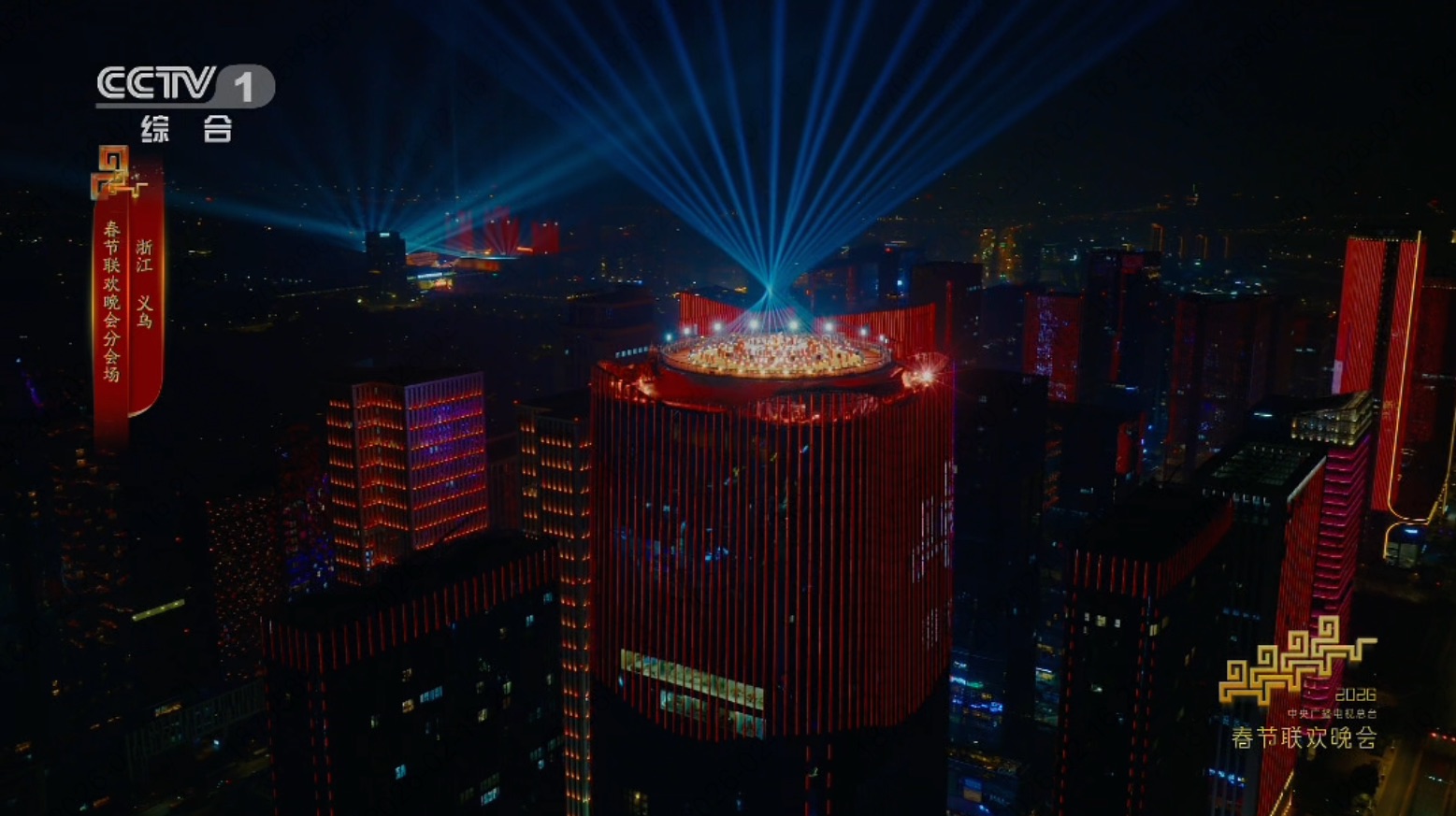 随着羽毛飞入“浙中之巅”,在义乌世贸中心屋顶上演非遗华章滚灯舞,铺展出一幅高楼林立、灯光璀璨的现代化都市歌舞升平、繁华景象。