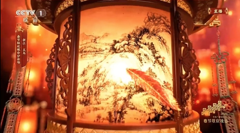 羽毛飞转时,画面中出现一展巨型宫灯,上面描绘着一幅《富春山居图》。截取的这段图景也是精心选择,既展示浙江山水风光,也暗含义乌跋山涉水“鸡毛换糖”的艰难开局。而这盏宫灯很值得说道,其原型是保存在赤岸镇尚阳村光裕堂的一盏历经400多年岁月的“传世珠灯”。“我们专程借来,融合义乌黄山八面厅、东阳木雕工艺等,由美术造型组重新创作。”据春晚义乌分会场导演组介绍,在西门老街出现的红灯笼,也同样是“珠灯”造型。