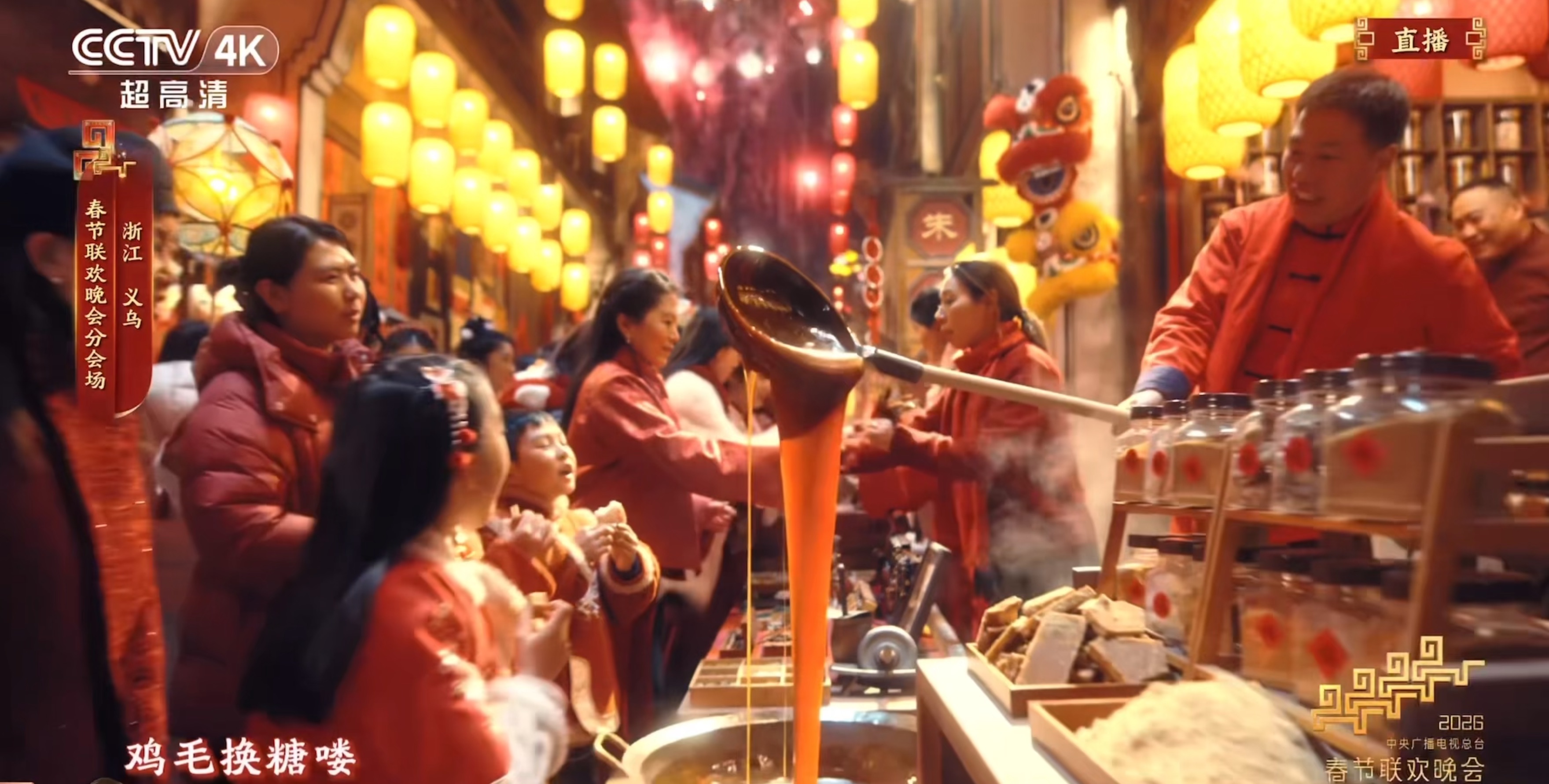 此外,在西门老街的非遗技艺展示中,观众可以看到一闪而现的义乌红糖制作场景、金华火腿、朱丹溪中医药文化以及道情、婺剧、拉线狮子、打铁花等。但在“看不见”的画面背后,西门老街共设置了10个非遗摊点参与春晚录制,包括孔村白糖、吴店馒头、义乌红粿、剪纸、东河肉饼、风筝、麻糍、麻糖,以及叠罗汉等。导演组表示,义乌非遗美食丰富,但因时长有限,在“入境”画面选择上,特别定格了义乌红糖,更契合“鸡毛换糖”主题。