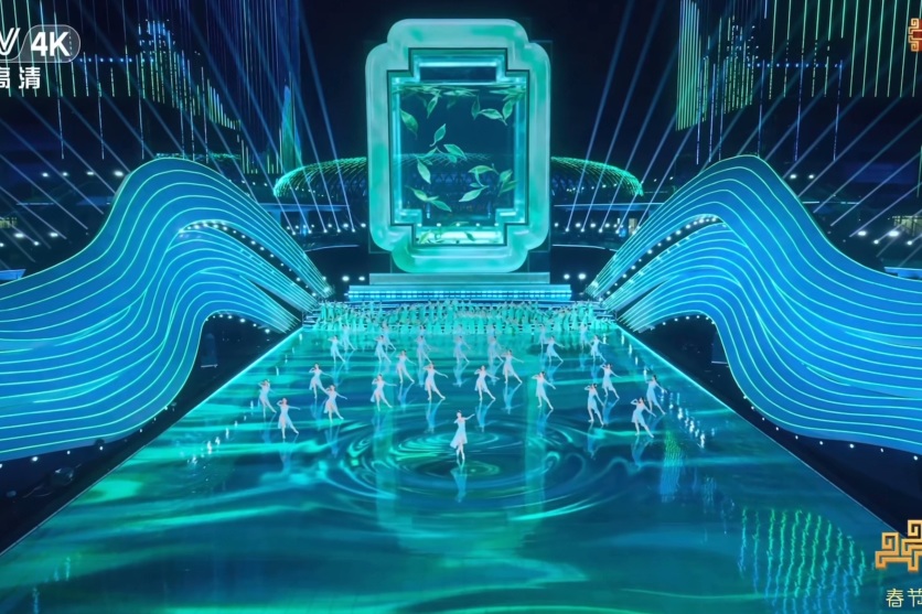 主舞台设计别具匠心,整体造型以巨型浪花与浙江山水地貌为元素,设计彰显“四海畅联、八方通达”的开放格局,结合主舞台开场演绎浙江传统民歌《采茶舞曲》,随着舞者跳跃,舞台地屏和烟花同时编织出钱塘江交汇的盛景。这些设计和场景呈现,暗喻着一代代之江儿女勇立潮头、奔涌向前的奋进姿态,以科技赋能和创新表达呈现新时代新征程的壮美图景,也再次呼应春晚“骐骥驰骋、势不可挡”的主题。