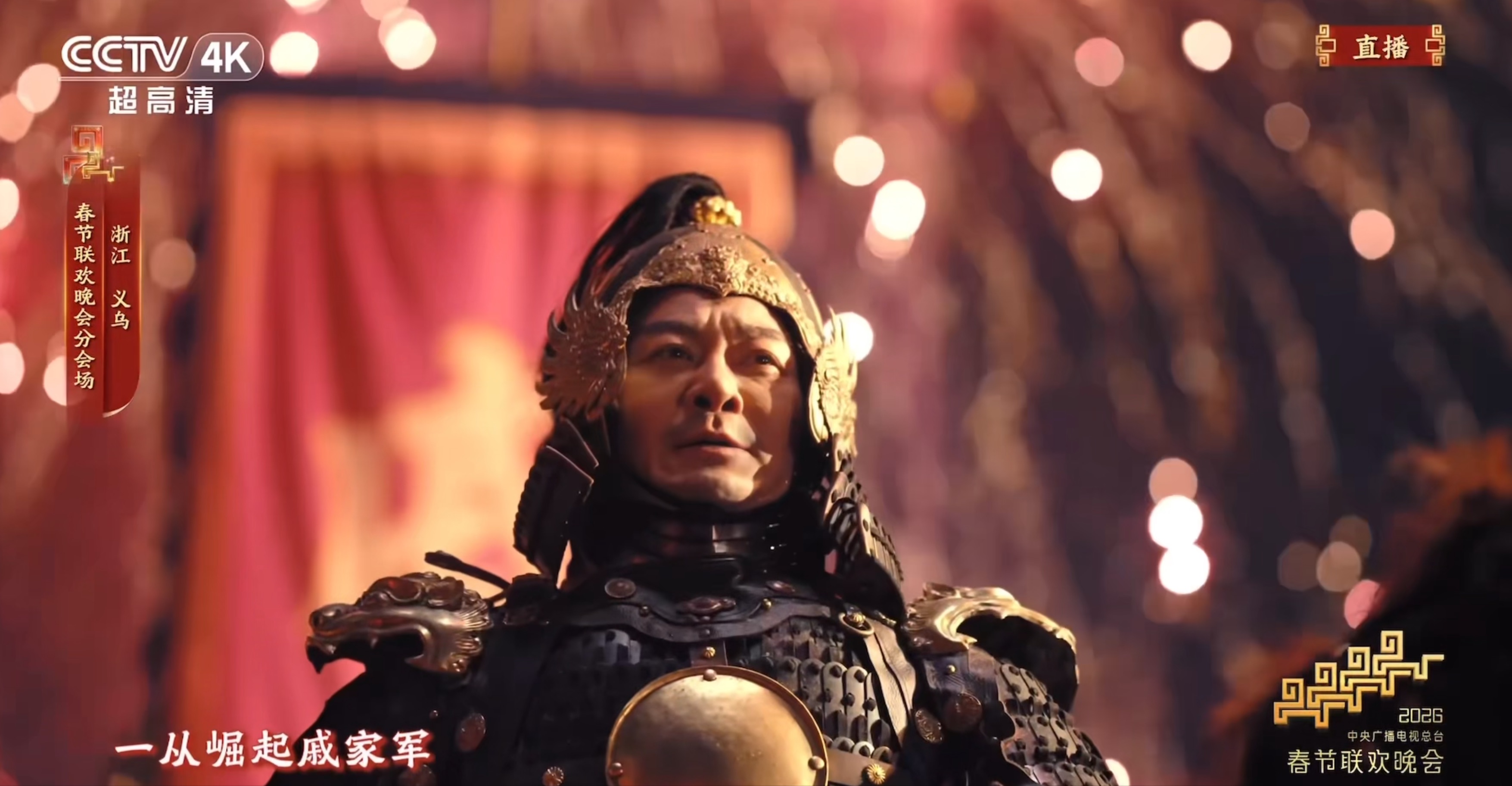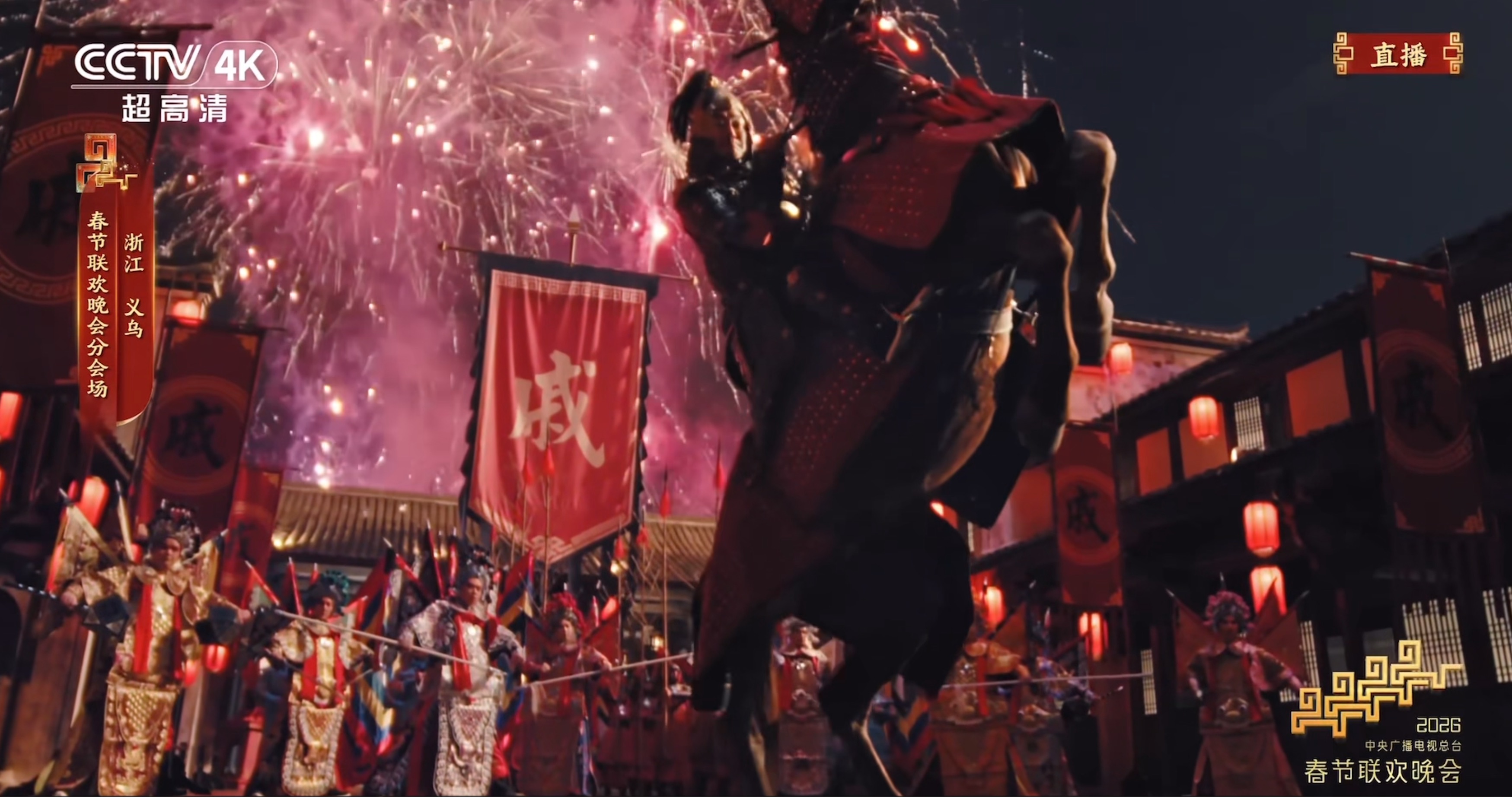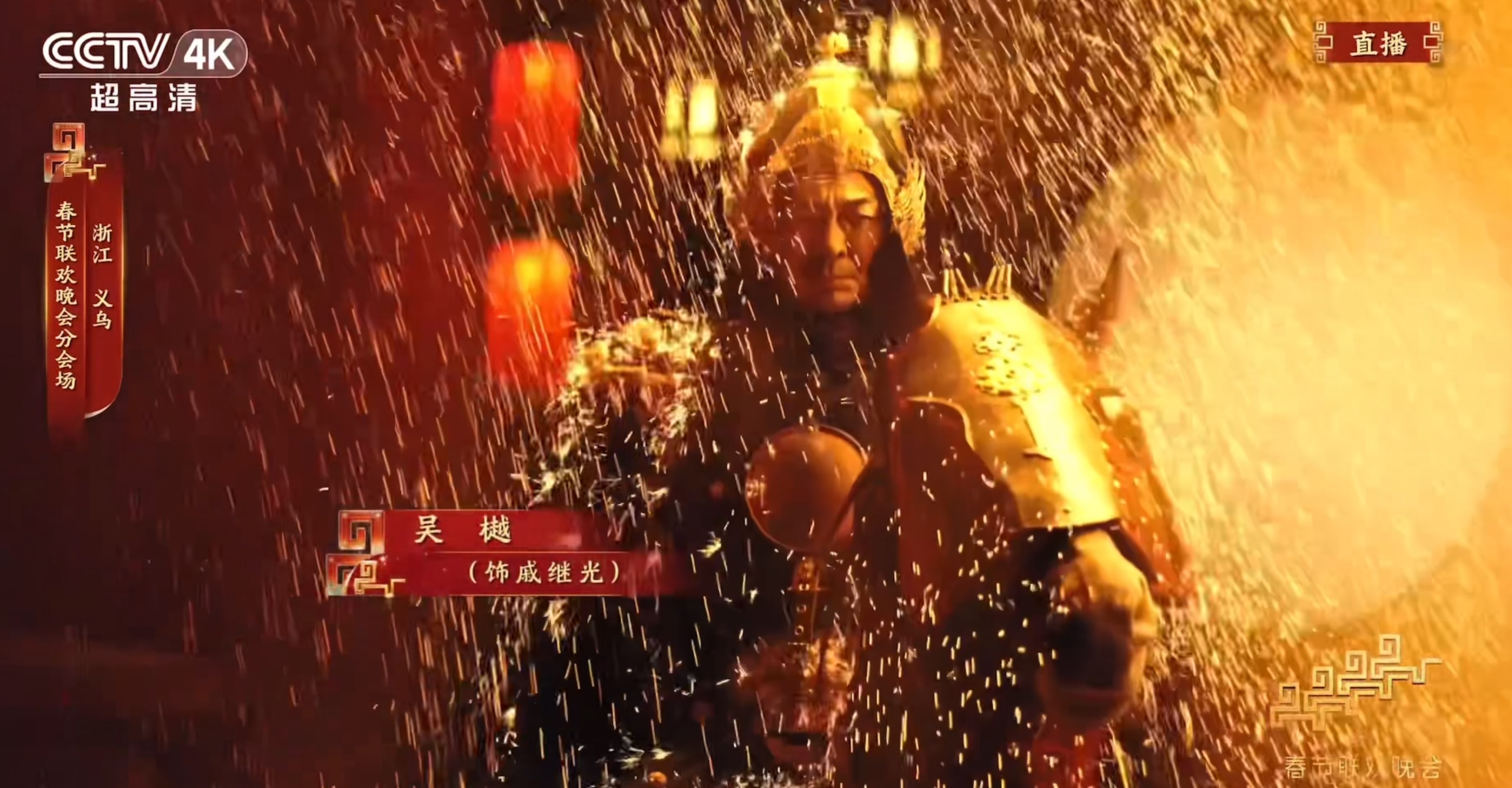 据悉,该节目邀请知名演员、国家武英级运动员吴樾扮演戚继光,与来自义乌婺剧保护传承中心的多名演员一同完成。画面中,旌旗猎猎战鼓擂,义乌婺剧演员扎靠披甲、眼神如电、威风凛凛,将那支令倭寇闻风丧胆的常胜军队赫赫声威演得淋漓尽致。“一从崛起戚家军,抗倭中坚义乌兵!”虽然只有短短一句唱词,但通过婺剧唱腔和演员念白双重演绎,尤其是身披甲胄的吴樾策着战马冲破漫天火帘(铁花),与身后刀光剑影的“义乌兵”融为一体时,那股忠勇无畏的英雄气概穿越荧幕直击人心,让观众看得热血沸腾。