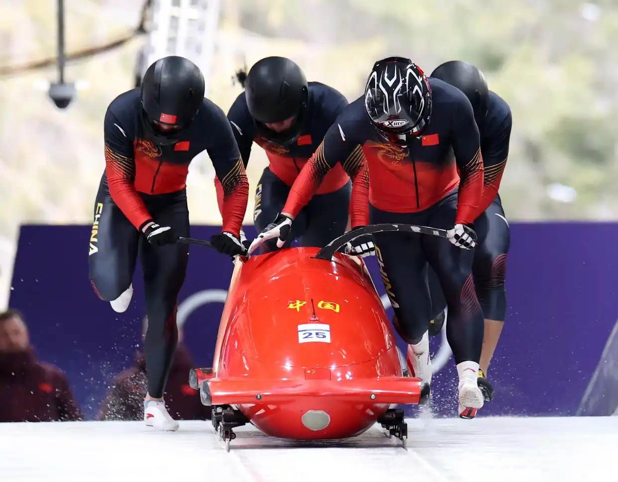 当地时间2月21日,中国队选手李纯键、姜茂源、叶杰龙、丁运达组成的四人车组参加比赛。他们在两轮比赛后暂列第18名。