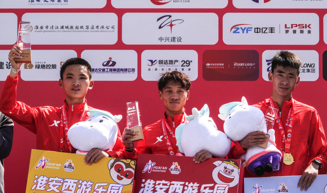 2021年的淮安马拉松,一脸稚气的丰配友(左一)首马就拿下亚军。新华社记者 杨磊 摄